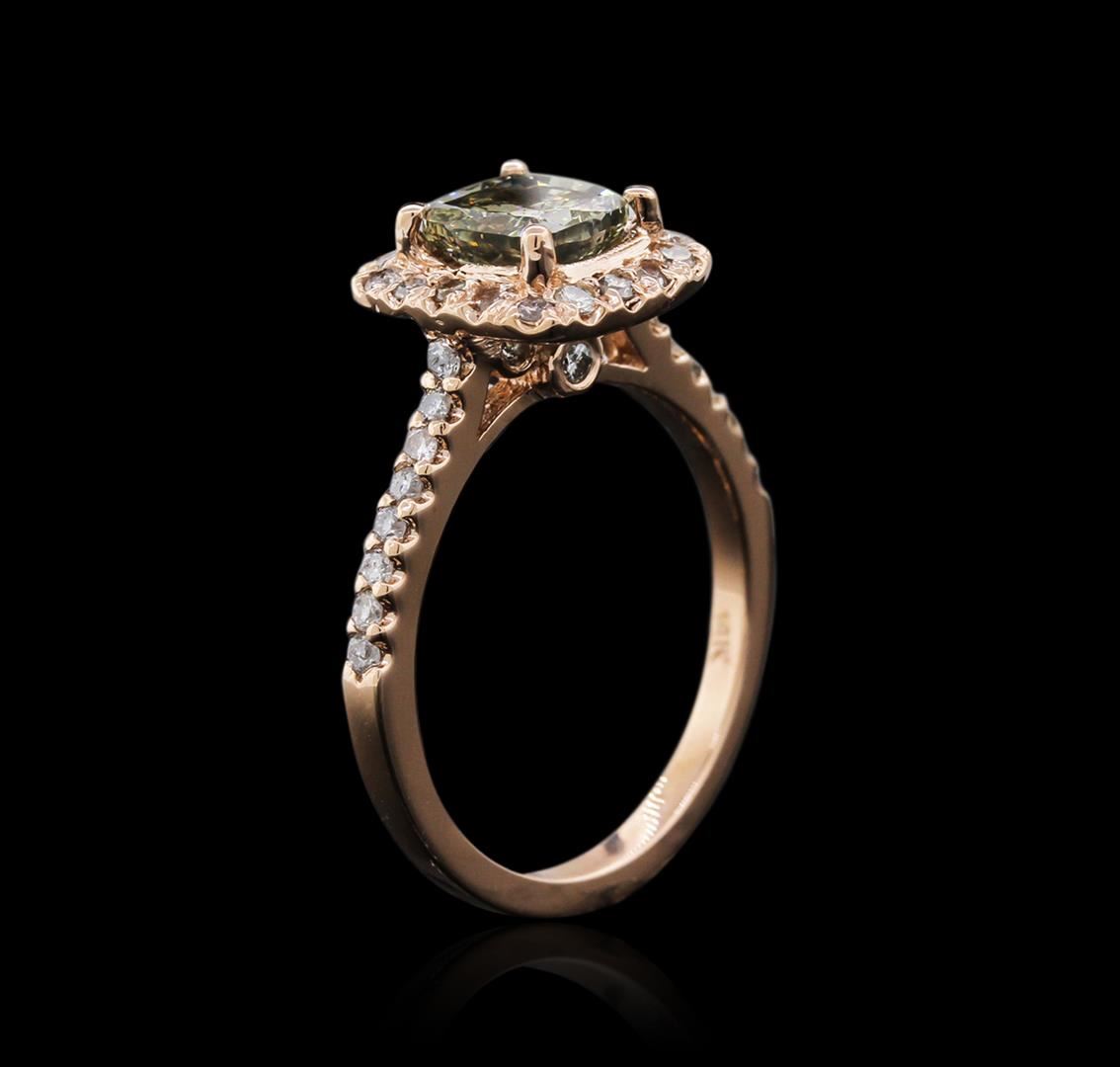 One electronically tested 14KT rose gold ladies cast diamond ring with a bright polish finish. Identified with markings of "14K". Condition is new. Containing: One prong set cushion cut diamond, measuring 6.40 x 6.40 x 3.97mm (depth est.) approximate weight of 1.38ct. Clarity: SI-2, color of Fancy Yellowish Green, Cut is Good. Whether the color of this diamond is of natural origin or an artificial process cannot currently be determined. Thirty-Five prong set round brilliant cut diamonds, measuring 1.30 - 1.30 x 0.78mm (depth est.) approximate total weight of 35 Stones = 0.28ct. Clarity: SI-2 to I-2. Color: K - L. All diamonds are graded in the mounting, unless otherwise stated. Total Weight of Diamonds 1.66ct. Total Weight of Ring 3.80 grams. GGL Appraised at $6,550.00.
