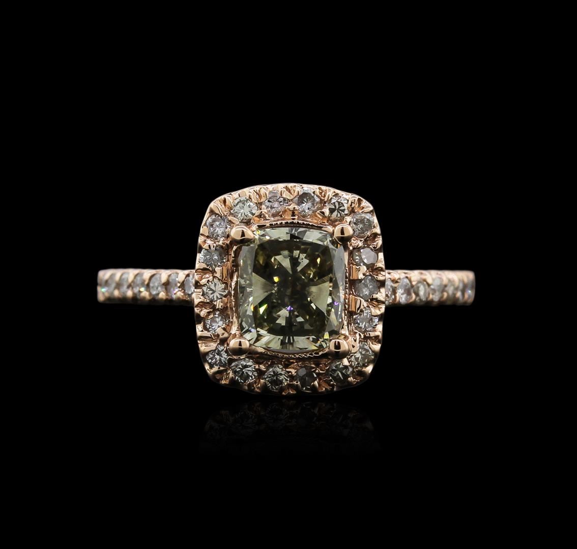 One electronically tested 14KT rose gold ladies cast diamond ring with a bright polish finish. Identified with markings of "14K". Condition is new. Containing: One prong set cushion cut diamond, measuring 6.40 x 6.40 x 3.97mm (depth est.) approximate weight of 1.38ct. Clarity: SI-2, color of Fancy Yellowish Green, Cut is Good. Whether the color of this diamond is of natural origin or an artificial process cannot currently be determined. Thirty-Five prong set round brilliant cut diamonds, measuring 1.30 - 1.30 x 0.78mm (depth est.) approximate total weight of 35 Stones = 0.28ct. Clarity: SI-2 to I-2. Color: K - L. All diamonds are graded in the mounting, unless otherwise stated. Total Weight of Diamonds 1.66ct. Total Weight of Ring 3.80 grams. GGL Appraised at $6,550.00.