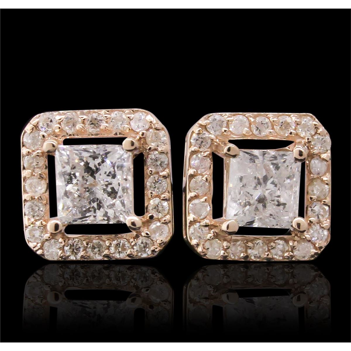 One pair electronically tested 14KT rose gold Ladies combination cast & die struck stud earrings with friction posts with a bright polish finish. Condition is new. Identified with markings of "14K". Containing: Two prong set princess cut diamonds, measuring 4.91 x 4.75 x 3.56mm (depth est.) approximate. Total Weight of 2 Stones = 1.36ct. Clarity: I-2 to I-3. Color: J, Cut is Good. Forty prong set round brilliant cut diamonds, measuring 1.30 - 1.30 x 0.78mm (depth est.) approximate. Total Weight of 40 Stones = 0.32ct. Clarity: I-2 to I-3. Color: I - J, Cut is Good. Total Weight of Diamonds 1.68ct. Total Weight of Earrings 2.30 grams. GGL Appraised at $5,920.00.