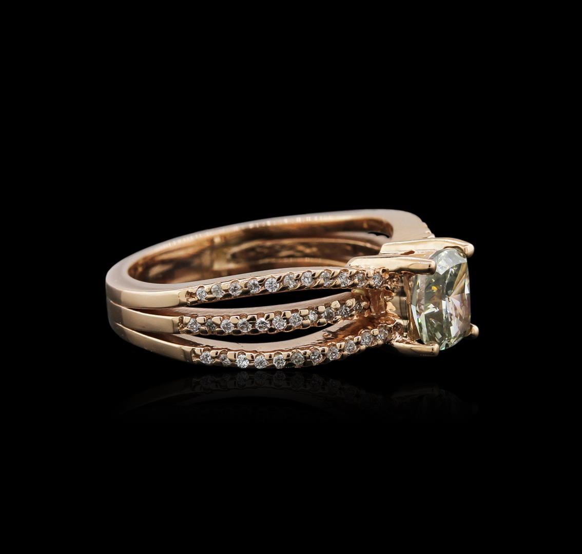 One electronically tested 14KT rose gold ladies cast diamond ring with a bright polish finish. Identified with markings of "14K". Condition is new. Containing: One prong set cushion cut diamond, measuring 6.70 x 5.50 x 4.14mm (depth est.) approximate weight of 1.30ct. Clarity: SI-1, color of Fancy Light Green, Cut is Good. Whether the color of this diamond is of natural origin or an artificial process cannot currently be determined. Sixty-Six prong set round brilliant cut diamonds, measuring 1.20 - 1.20 x 0.72mm (depth est.) approximate total weight of 66 Stones = 0.42ct. Clarity: I-1 to I-2. Color: J - K, Cut is Good. All diamonds are graded in the mounting, unless otherwise stated. Total Weight of Diamonds 1.71ct. Total Weight of Ring 6.00 grams. GGL Appraised at $5,735.00.