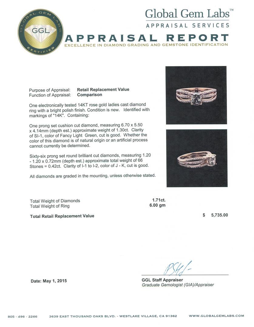 One electronically tested 14KT rose gold ladies cast diamond ring with a bright polish finish. Identified with markings of "14K". Condition is new. Containing: One prong set cushion cut diamond, measuring 6.70 x 5.50 x 4.14mm (depth est.) approximate weight of 1.30ct. Clarity: SI-1, color of Fancy Light Green, Cut is Good. Whether the color of this diamond is of natural origin or an artificial process cannot currently be determined. Sixty-Six prong set round brilliant cut diamonds, measuring 1.20 - 1.20 x 0.72mm (depth est.) approximate total weight of 66 Stones = 0.42ct. Clarity: I-1 to I-2. Color: J - K, Cut is Good. All diamonds are graded in the mounting, unless otherwise stated. Total Weight of Diamonds 1.71ct. Total Weight of Ring 6.00 grams. GGL Appraised at $5,735.00.