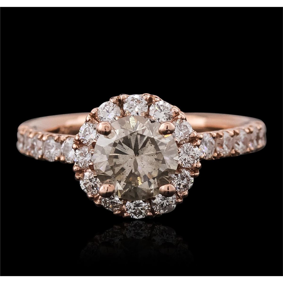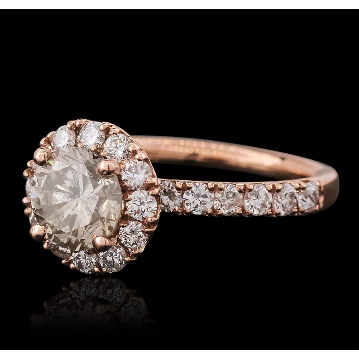 One electronically tested 14KT rose gold ladies combination cast & assembled engagement ring with a flat shank with a bright polish finish. Identified with markings of "14K". Condition is new. Containing: One prong set round brilliant cut diamond, measuring 6.77 - 6.76 x 4.26mm (depth est.) approximate weight of 1.19ct. Clarity: I-2. Color: L, Cut is Good. Twenty-Four prong set round brilliant cut diamonds, measuring 1.90 - 1.80 x 1.11mm (depth est.) approximate total weight of 24 Stones = 0.55ct. Clarity: SI-1. Color: I - J, Cut is Good. All diamonds are graded in the mounting, unless otherwise stated. Total Weight of Diamonds 1.74ct. Total Weight of Ring 3.30 grams. GGL Appraised at $10,655.00.