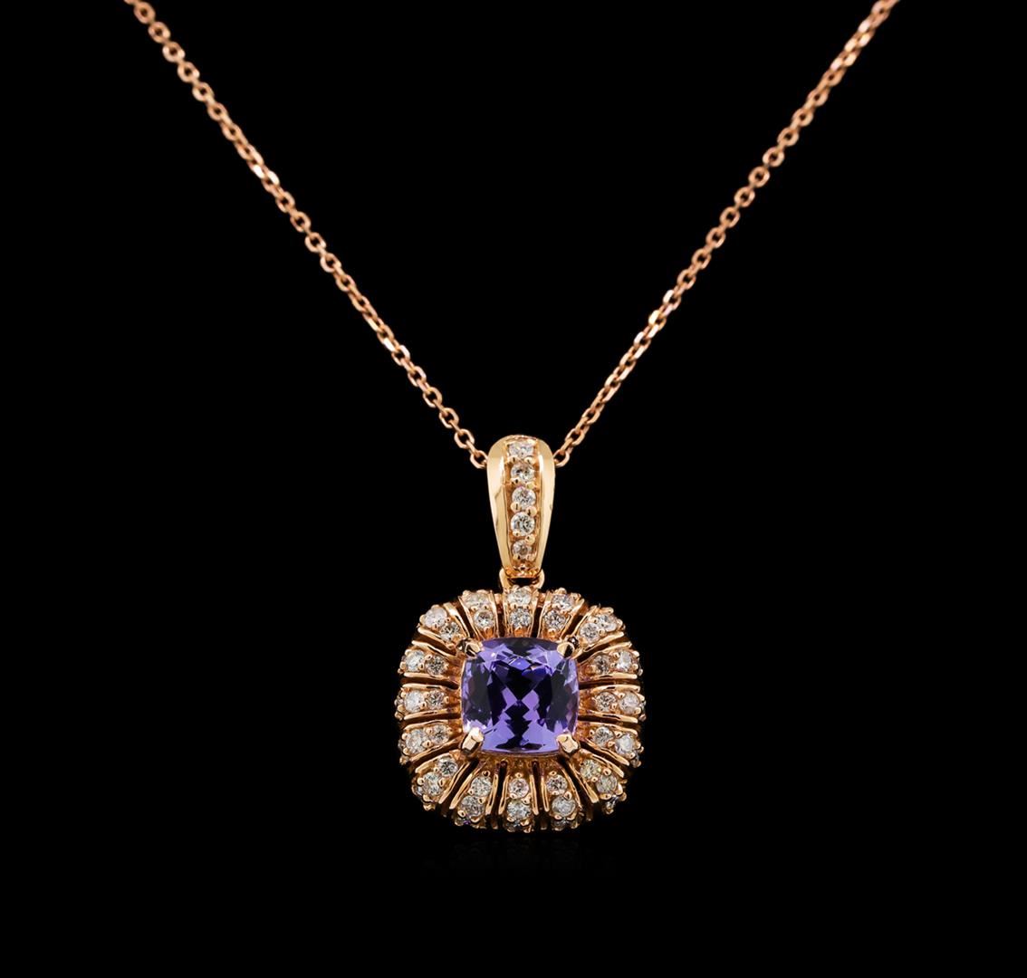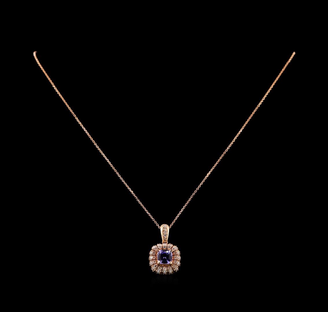 One electronically tested 14KT rose gold ladies cast tanzanite and diamond pendant & chain 18.0" long, with a spring ring clasp with a bright polish finish. Identified with markings of "14K". Condition is new. Containing: One prong set oval square cushion modified brilliant cut natural tanzanite, measuring 7.00 x 7.00 x 4.55mm, approximate weight of 1.76ct., clarity is eye clean, type I, medium light, very slightly grayish, violet color, (GIA V 4/3), cut is good. Thirty-Seven prong set round brilliant cut diamonds, measuring 1.30 - 1.30 x 0.78mm (depth est.) approximate total weight of 37 Stones = 0.30ct. Clarity: SI-2 to I-1. Color: I - J, Cut is Good. Colored gemstones are presumed to have been subjected to commonly used enhancement processes. All diamonds and colored gemstones are graded in the mounting, unless otherwise stated. Total Weight of Colored Stones 1.76ct. Total Weight of Diamonds 0.30ct. Total Weight of Pendant & Chain 5.50 grams. GGL Appraised at $3,050.00.