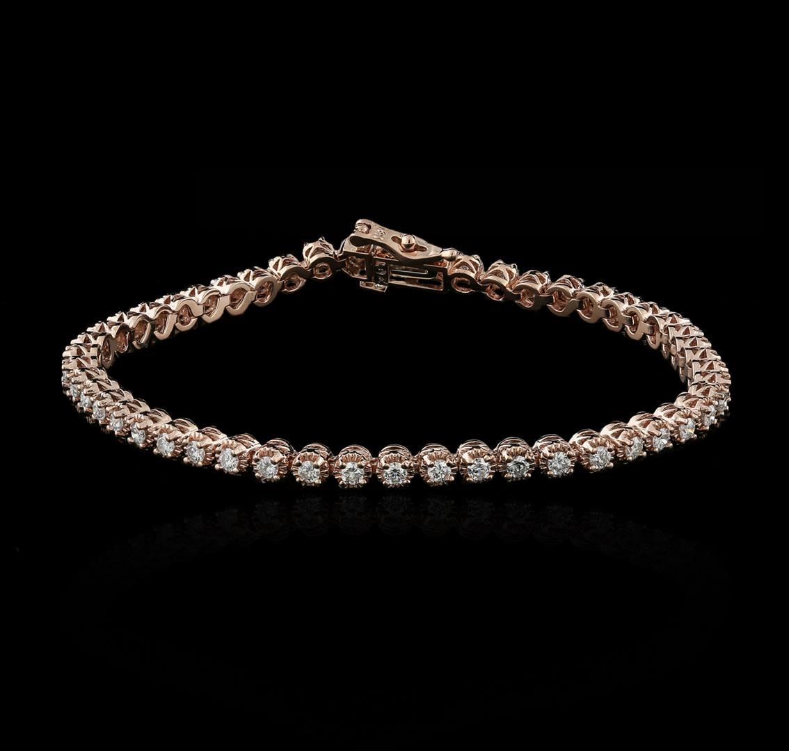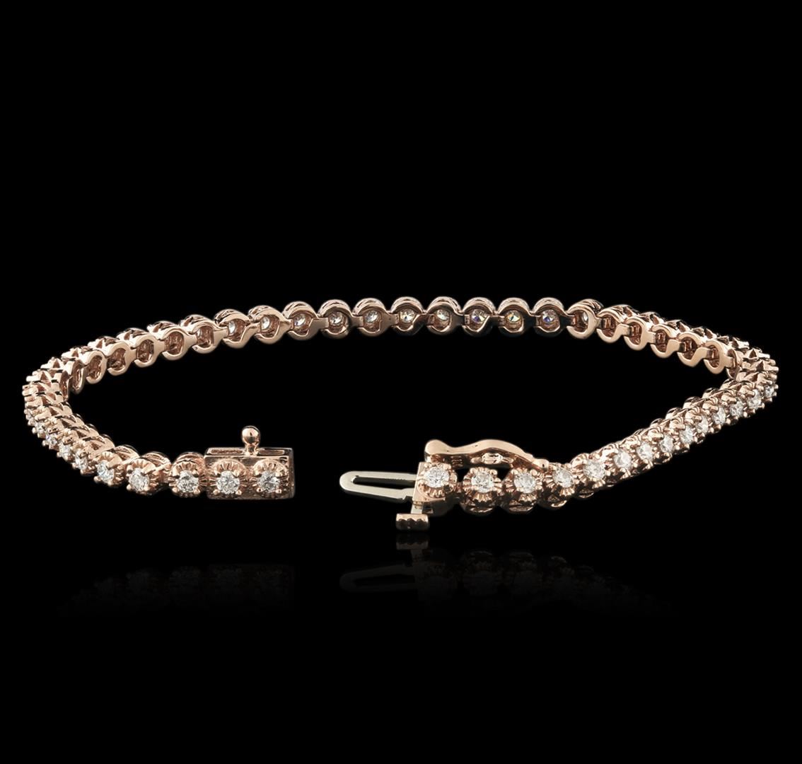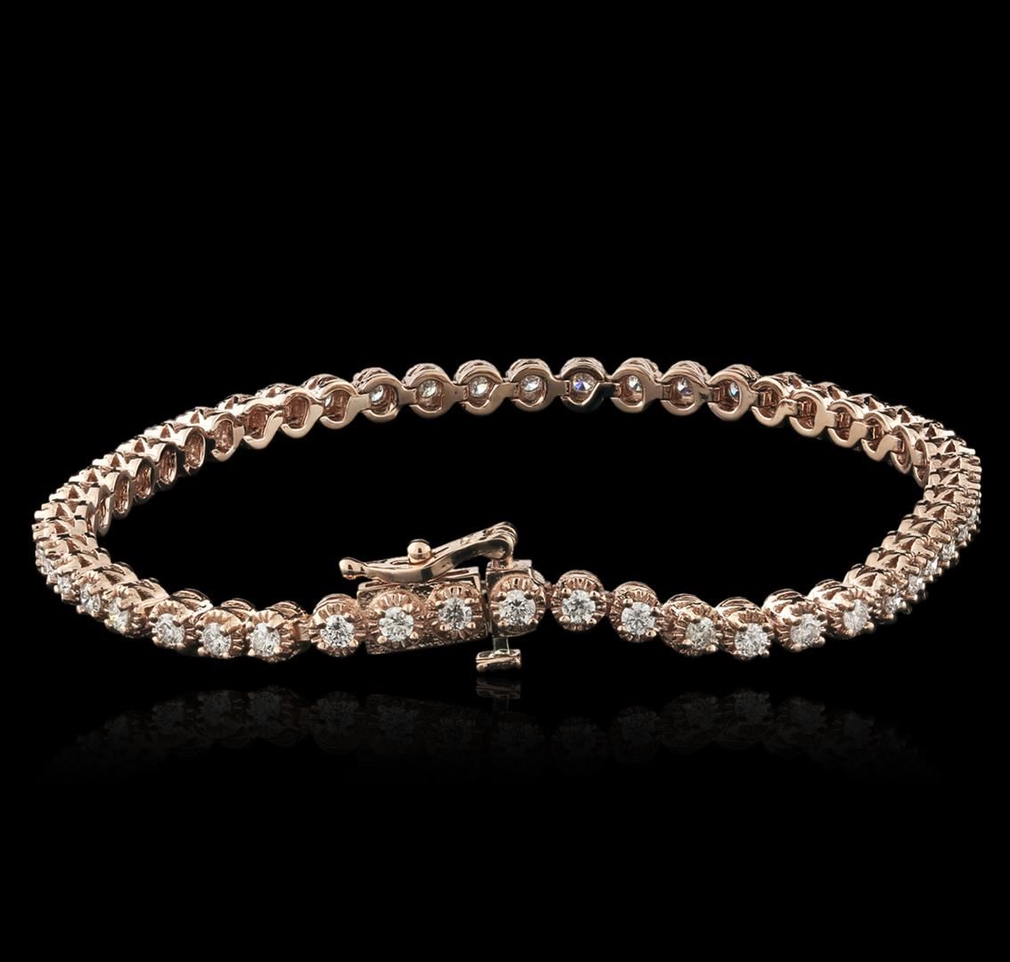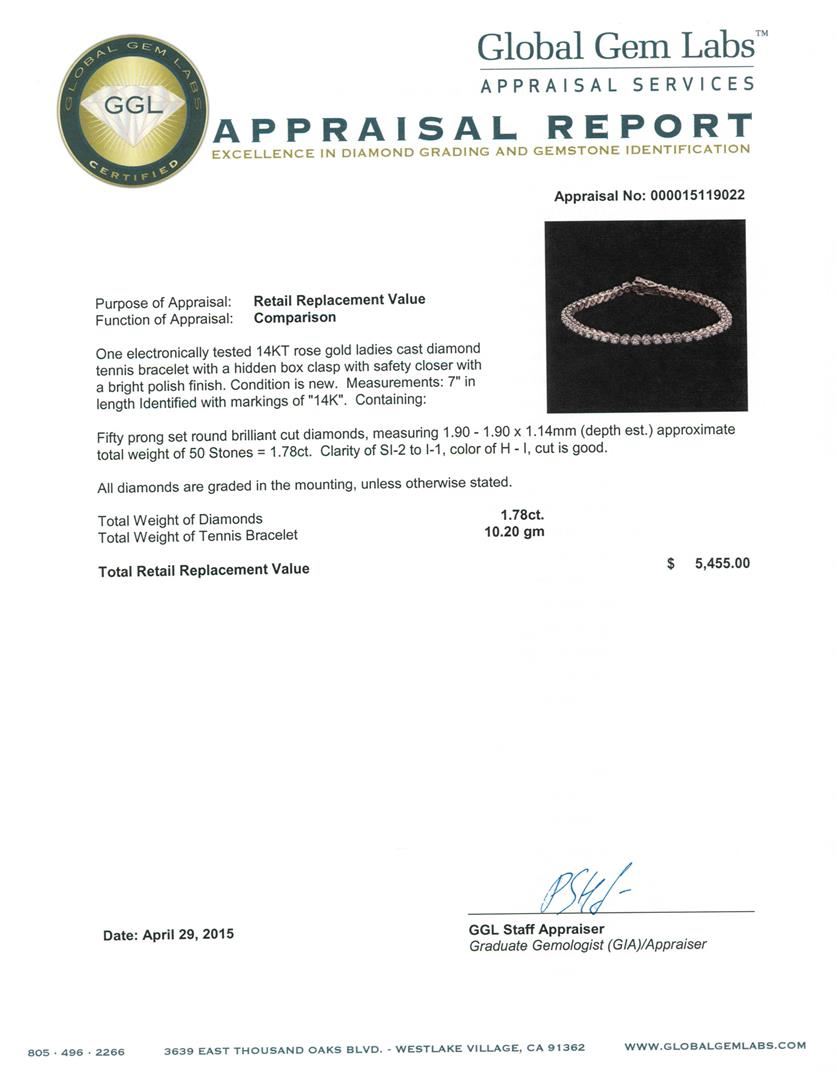 One electronically tested 14KT rose gold ladies cast diamond tennis bracelet with a hidden box clasp with safety closer with a bright polish finish. Measurements: 7" in length Identified with markings of "14K". Condition is new. Containing: Fifty prong set round brilliant cut diamonds, measuring 1.90 - 1.90 x 1.14mm (depth est.) approximate total weight of 50 Stones = 1.78ct. Clarity: SI-2 to I-1. Color: H - I, Cut is Good. All diamonds are graded in the mounting, unless otherwise stated. Total Weight of Diamonds 1.78ct. Total Weight of Tennis Bracelet 10.20 grams. GGL Appraised at $5,455.00.