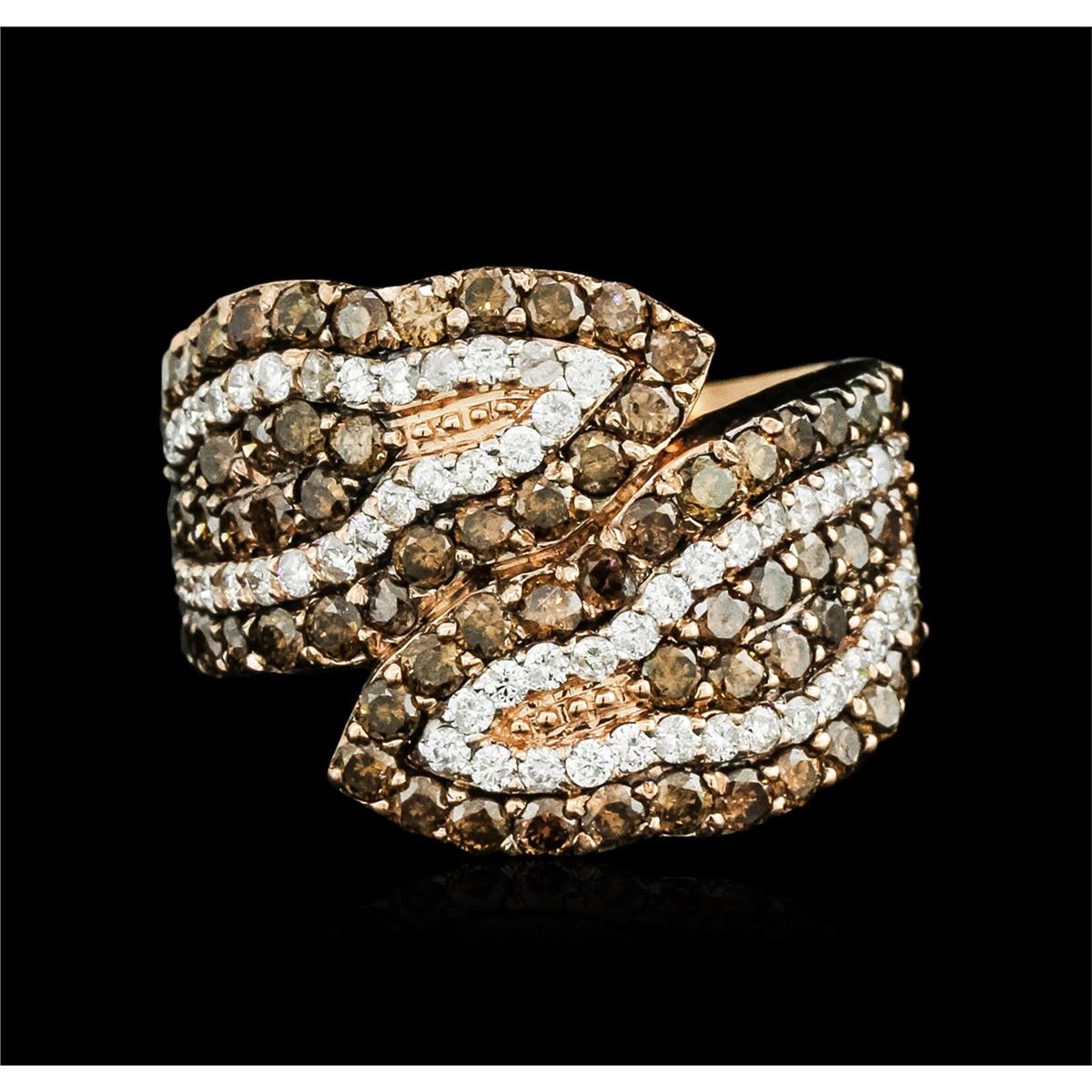 One electronically tested 14KT rose gold ladies cast diamond ring with a bright polish finish. Identified with markings of "14K". Condition is new. Containing: Fifty-Eight prong set round brilliant cut diamonds, measuring 1.31 - 1.30 x 0.79mm (depth est.) approximate total weight of 58 Stones = 0.48ct. Clarity: SI-2 to I-1. Color: I - J. Sixty-Four prong set round brilliant cut diamonds, measuring 1.80 - 1.80 x 1.08mm (depth est.) approximate total weight of 64 Stones = 1.36ct. Clarity: SI-2 to I-1. All diamonds are graded in the mounting, unless otherwise stated. Total Weight of Diamonds 1.84ct. Total Weight of Ring 7.40 grams. GGL Appraised at $4,770.00.