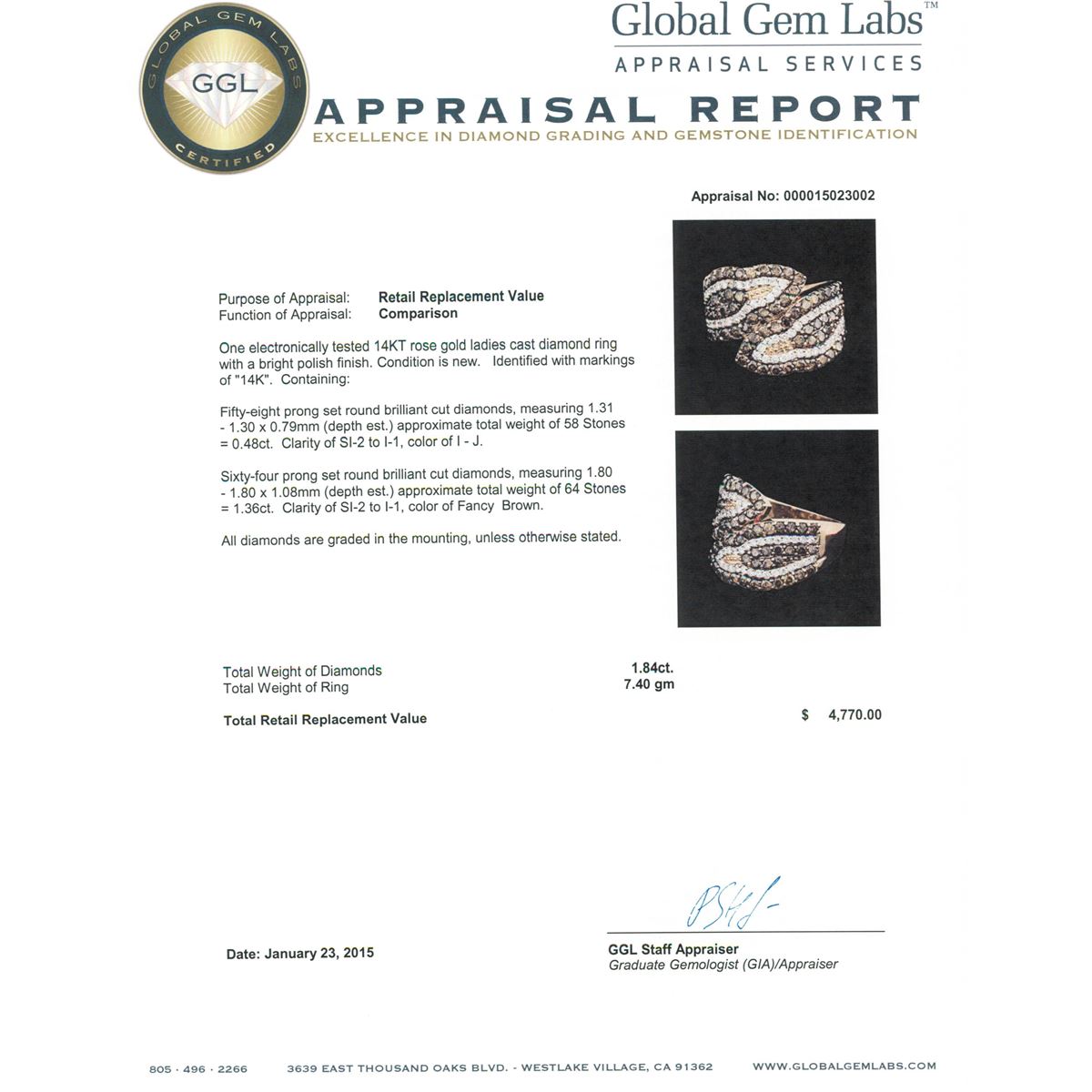 One electronically tested 14KT rose gold ladies cast diamond ring with a bright polish finish. Identified with markings of "14K". Condition is new. Containing: Fifty-Eight prong set round brilliant cut diamonds, measuring 1.31 - 1.30 x 0.79mm (depth est.) approximate total weight of 58 Stones = 0.48ct. Clarity: SI-2 to I-1. Color: I - J. Sixty-Four prong set round brilliant cut diamonds, measuring 1.80 - 1.80 x 1.08mm (depth est.) approximate total weight of 64 Stones = 1.36ct. Clarity: SI-2 to I-1. All diamonds are graded in the mounting, unless otherwise stated. Total Weight of Diamonds 1.84ct. Total Weight of Ring 7.40 grams. GGL Appraised at $4,770.00.