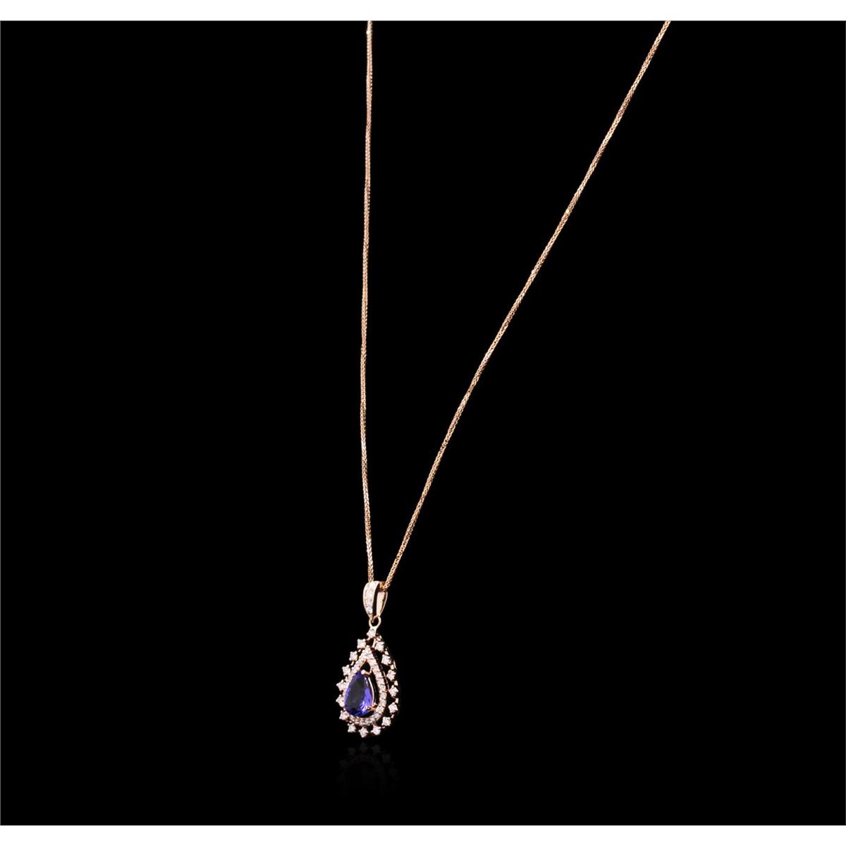 One electronically tested 14KT rose gold ladies cast tanzanite and diamond pendant & chain 18.0" long, herringbone link with a lobster claw clasp with a bright polish finish. Identified with markings of "14K". Condition is new. Containing: One prong set pear modified brilliant cut natural tanzanite, measuring 9.90 x 6.80 x 4.42mm, approximate total weight of 1.99ct., clarity is eye clean, type I, medium light, moderately strong, violet color, (GIA V 4/4), cut is good. Forty-Two prong set round brilliant cut diamonds, measuring 1.70 - 1.30 x 0.90mm (depth est.) approximate total weight of 42 Stones = 0.52ct. Clarity: SI-2 to I-1. Color: I - J, Cut is Good. Five prong set round brilliant cut diamonds, measuring 1.90 - 1.80 x 1.11mm (depth est.) approximate total weight of 5 Stones = 0.12ct. Clarity: SI-2. Color: H - I, Cut is Good. Colored gemstones are presumed to have been subjected to commonly used enhancement processes. All diamonds and colored gemstones are graded in the mounting, unless otherwise stated. Total Weight of Colored Stones 1.99ct. Total Weight of Diamonds 0.63ct. Total Weight of Pendant & Chain 5.40 grams. GGL Appraised at $3,700.00.