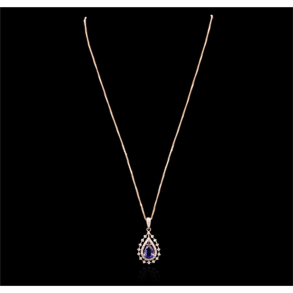 One electronically tested 14KT rose gold ladies cast tanzanite and diamond pendant & chain 18.0" long, herringbone link with a lobster claw clasp with a bright polish finish. Identified with markings of "14K". Condition is new. Containing: One prong set pear modified brilliant cut natural tanzanite, measuring 9.90 x 6.80 x 4.42mm, approximate total weight of 1.99ct., clarity is eye clean, type I, medium light, moderately strong, violet color, (GIA V 4/4), cut is good. Forty-Two prong set round brilliant cut diamonds, measuring 1.70 - 1.30 x 0.90mm (depth est.) approximate total weight of 42 Stones = 0.52ct. Clarity: SI-2 to I-1. Color: I - J, Cut is Good. Five prong set round brilliant cut diamonds, measuring 1.90 - 1.80 x 1.11mm (depth est.) approximate total weight of 5 Stones = 0.12ct. Clarity: SI-2. Color: H - I, Cut is Good. Colored gemstones are presumed to have been subjected to commonly used enhancement processes. All diamonds and colored gemstones are graded in the mounting, unless otherwise stated. Total Weight of Colored Stones 1.99ct. Total Weight of Diamonds 0.63ct. Total Weight of Pendant & Chain 5.40 grams. GGL Appraised at $3,700.00.