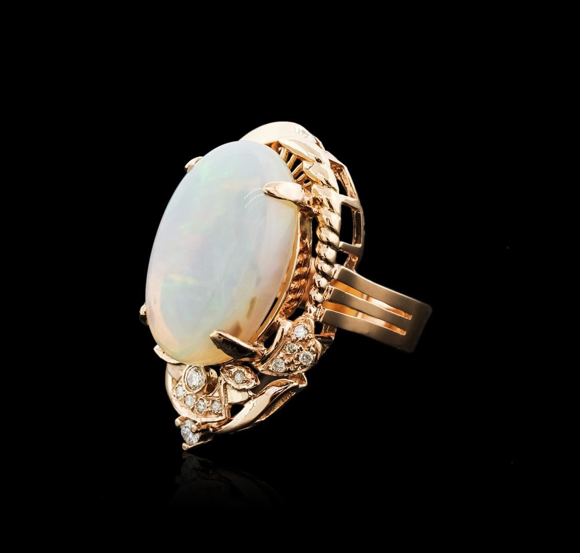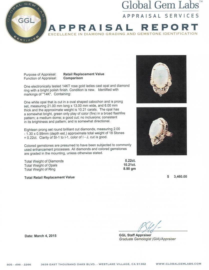 One electronically tested 14KT rose gold ladies cast opal and diamond ring with a bright polish finish. Identified with markings of "14K". Condition is new. Containing: One white opal that is cut in a oval shaped cabochon and is prong set, measuring 21.00. mm long x 13.00. mm wide, and 6.00. mm thick and the approximate weight is 10.21 carats. The opal has a somewhat bright, green only play of color (fire) in a broad flashfire pattern; a medium dome; a good cut; no inclusions; consistent in its brightness and pattern; and is somewhat directional. Eighteen prong set round brilliant cut diamonds, measuring 2.00. - 1.30 x 0.99mm (depth est.) approximate total weight of 18 Stones = 0.22ct. Clarity: SI-1 to I-1. Color: I - J, Cut is Good. Colored gemstones are presumed to have been subjected to commonly used enhancement processes. All diamonds and colored gemstones are graded in the mounting, unless otherwise stated. Total Weight of Diamonds 0.22ct. Total Weight of Opals 10.21ct. Total Weight of Ring 8.90 grams. GGL Appraised at $3,460.00.