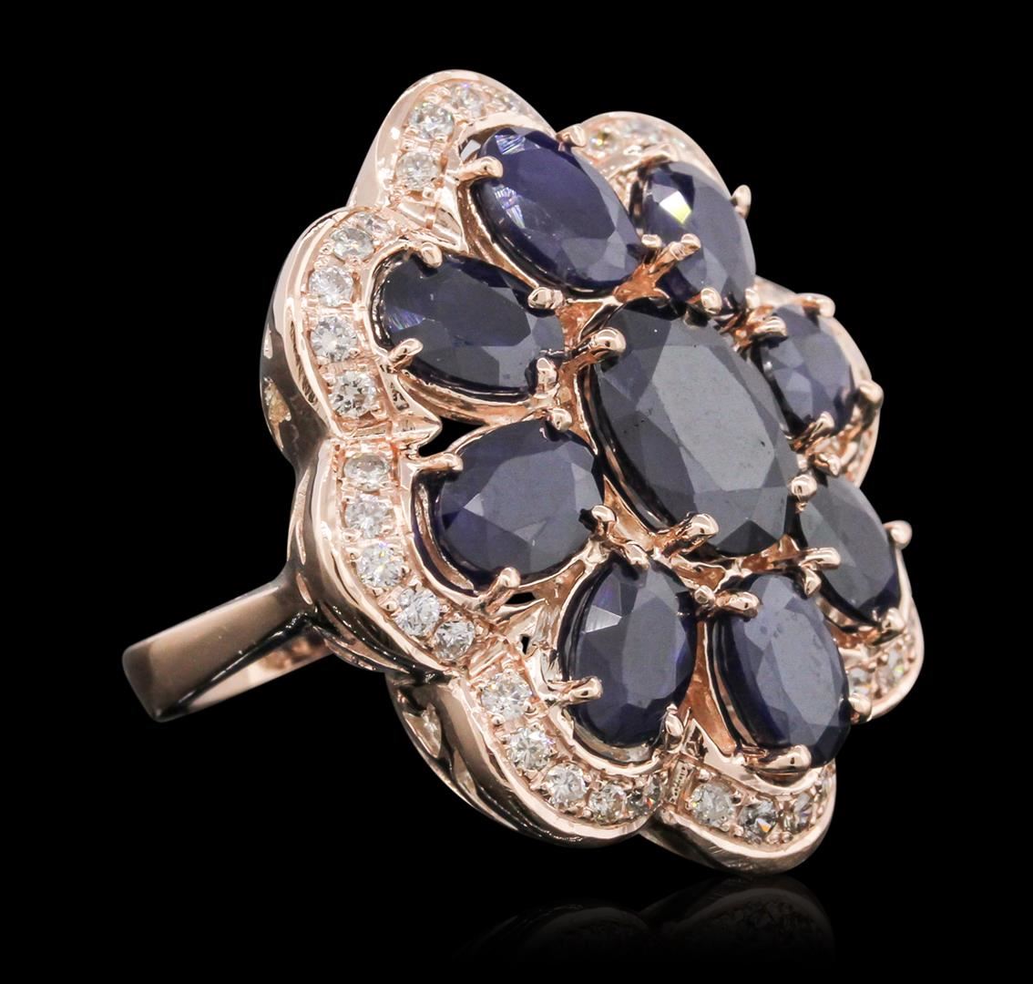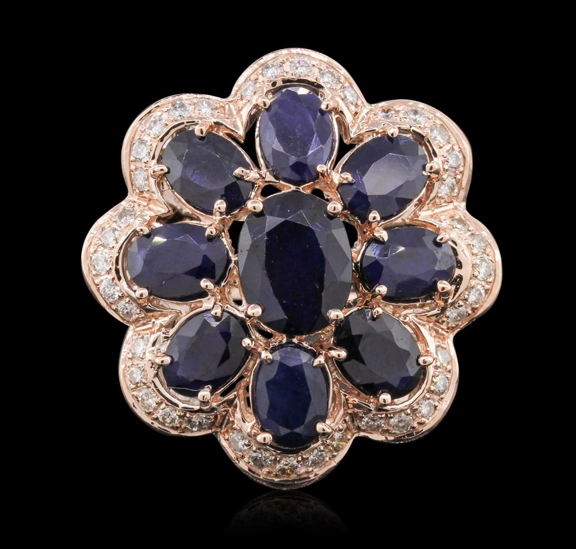 One electronically tested 14KT rose gold ladies cast sapphire and diamond ring with a bright polish finish. Condition is new, good workmanship. The ring features a sapphire floret set within a stylized diamond bezel, completed by a three millimeter wide band. Identified with markings of "14K". Containing: One prong set oval mixed cut natural blue sapphire, measuring 10.00 x 7.50 x 4.75mm, 5%. bulge factor, approximate weight of 3.15ct., clarity is severely included, type II, dark, very slightly grayish, violetish blue color, (GIA vB 7/3), cut is good. Transmitting light very diffusely, opaque. Naturally occurring internal & external characteristics are present. Indications of multiple laboratory enhancements, including high temperature heat treatment and diffusion treatment. Graded in the setting. Eight prong set oval mixed cut natural blue sapphires, measuring 7.00 x 5.00 x 3.10mm, approximate. Total Weight of 7.22ct., clarity is heavily included, type II, medium dark, very slightly grayish, violetish blue color, (GIA vB 6/3), cut is good. Transmitting light diffusely translucent. Naturally occurring internal & external characteristics are present, including partial color zoning. Measurements & the color grade are an average for the group. Indications of multiple laboratory enhancements, including high temperature heat treatment and diffusion treatment. Graded in the setting. Forty bead set round brilliant cut diamonds, measuring 1.70 - 1.60 x 0.99mm (depth est.) approximate. Total Weight of 40 Stones = 0.75ct. Graded in the setting. Clarity: VS-2 to SI-2. Color: H - J. Total Weight of Colored Stones 10.37ct. Total Weight of Diamonds 0.75ct. Total Weight of Ring 16.69 grams. AIG Appraised at $7,345.00.