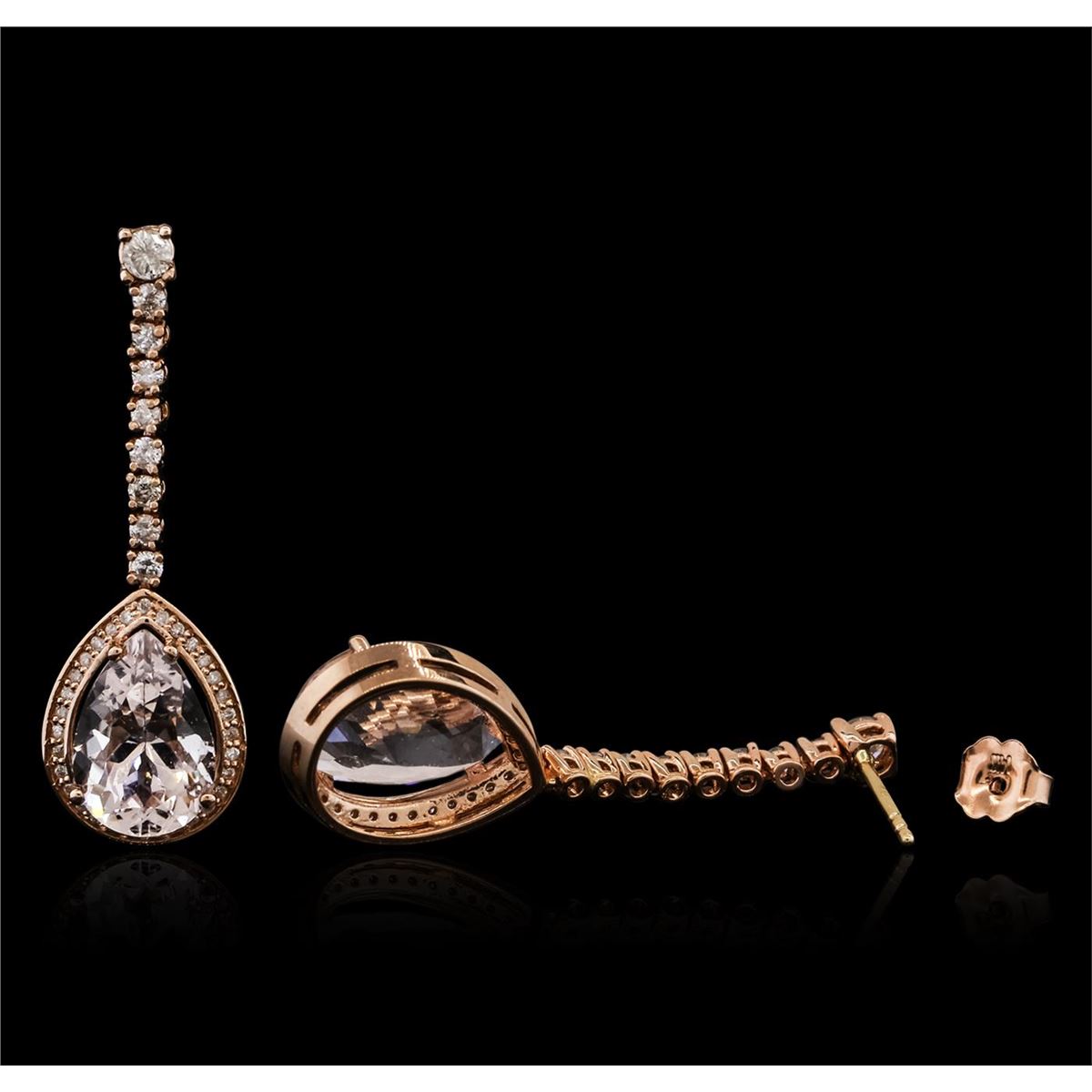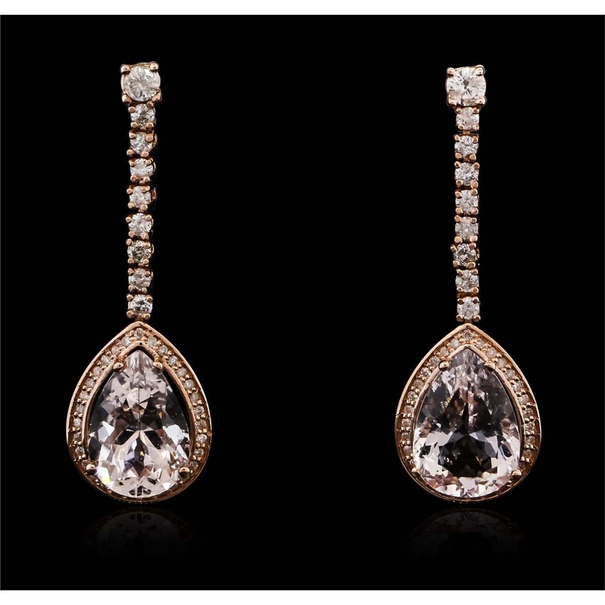 One pair electronically tested 14KT rose gold ladies combination cast & assembled morganite and diamond dangle earrings with friction posts with a bright polish finish. Identified with markings of "14K". Condition is new. Containing: Two prong set pear modified brilliant cut natural morganites, measuring 14.40 x 10.00 x 6.80mm, approximate total weight of 10.66ct., clarity is eye clean, type I, very light, very slightly brownish, red orange color, (GIA RO 2/3), cut is good. Two prong set round brilliant cut diamonds, measuring 3.20 - 3.20 x 1.92mm (depth est.) approximate total weight of 2 Stones = 0.24ct. Clarity: I-2 to I-3. Color: I - J, Cut is Good. Sixteen prong set round brilliant cut diamonds, measuring 2.00 - 2.00 x 1.20mm (depth est.) approximate total weight of 16 Stones = 0.47ct. Clarity: I-1 to I-3. Color: I - J, Cut is Good. Sixty-Two prong set round brilliant cut diamonds, measuring 1.00 - 1.00 x 0.60mm (depth est.) approximate total weight of 62 Stones = 0.22ct. Clarity: I-1 to I-3. Color: I - J, Cut is Good. Colored gemstones are presumed to have been subjected to commonly used enhancement processes. All diamonds and colored gemstones are graded in the mounting, unless otherwise stated. Total Weight of Colored Stones 10.66ct. Total Weight of Diamonds 0.93ct. Total Weight of Dangle Earrings 8.70 grams. GGL Appraised at $4,290.00.