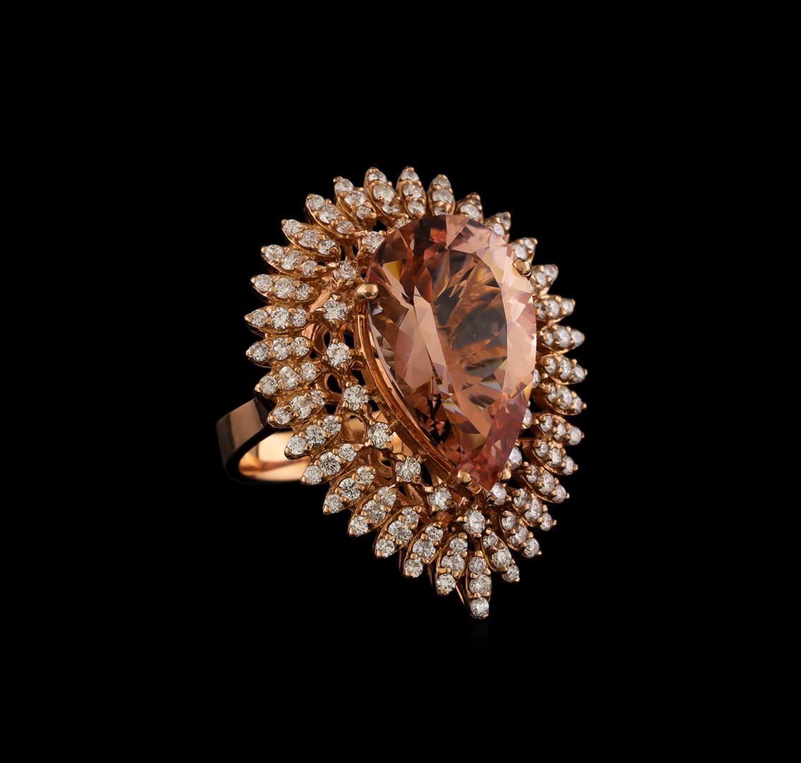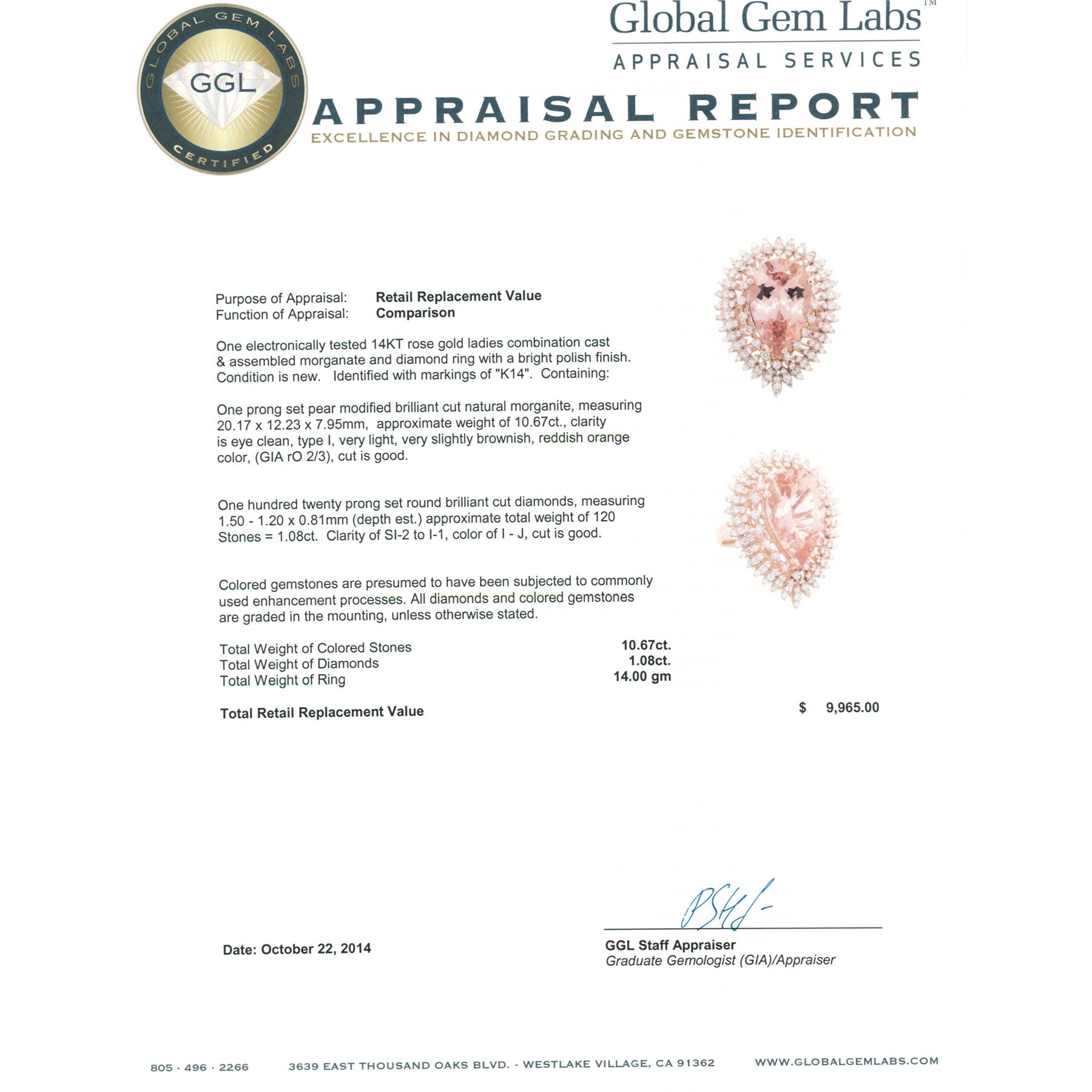 One electronically tested 14KT rose gold ladies combination cast & assembled morganite and diamond ring with a bright polish finish. Identified with markings of "K14". Condition is new. Containing: One prong set pear modified brilliant cut natural morganite, measuring 20.17 x 12.23 x 7.95mm, approximate weight of 10.67ct., clarity is eye clean, type I, very light, very slightly brownish, reddish orange color, (GIA rO 2/3), cut is good. One Hundred Twenty prong set round brilliant cut diamonds, measuring 1.50 - 1.20 x 0.81mm (depth est.) approximate total weight of 120 Stones = 1.08ct. Clarity: SI-2 to I-1. Color: I - J, Cut is Good. Colored gemstones are presumed to have been subjected to commonly used enhancement processes. All diamonds and colored gemstones are graded in the mounting, unless otherwise stated. Total Weight of Colored Stones 10.67ct. Total Weight of Diamonds 1.08ct. Total Weight of Ring 14.00 grams. GGL Appraised at $9,965.00.