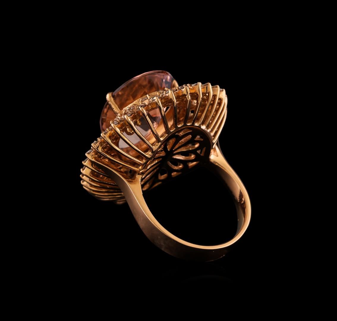 One electronically tested 14KT rose gold ladies combination cast & assembled morganite and diamond ring with a bright polish finish. Identified with markings of "K14". Condition is new. Containing: One prong set pear modified brilliant cut natural morganite, measuring 20.17 x 12.23 x 7.95mm, approximate weight of 10.67ct., clarity is eye clean, type I, very light, very slightly brownish, reddish orange color, (GIA rO 2/3), cut is good. One Hundred Twenty prong set round brilliant cut diamonds, measuring 1.50 - 1.20 x 0.81mm (depth est.) approximate total weight of 120 Stones = 1.08ct. Clarity: SI-2 to I-1. Color: I - J, Cut is Good. Colored gemstones are presumed to have been subjected to commonly used enhancement processes. All diamonds and colored gemstones are graded in the mounting, unless otherwise stated. Total Weight of Colored Stones 10.67ct. Total Weight of Diamonds 1.08ct. Total Weight of Ring 14.00 grams. GGL Appraised at $9,965.00.