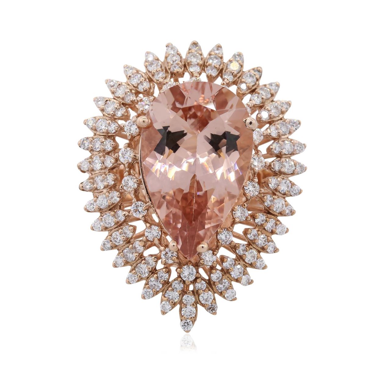 One electronically tested 14KT rose gold ladies combination cast & assembled morganite and diamond ring with a bright polish finish. Identified with markings of "K14". Condition is new. Containing: One prong set pear modified brilliant cut natural morganite, measuring 20.17 x 12.23 x 7.95mm, approximate weight of 10.67ct., clarity is eye clean, type I, very light, very slightly brownish, reddish orange color, (GIA rO 2/3), cut is good. One Hundred Twenty prong set round brilliant cut diamonds, measuring 1.50 - 1.20 x 0.81mm (depth est.) approximate total weight of 120 Stones = 1.08ct. Clarity: SI-2 to I-1. Color: I - J, Cut is Good. Colored gemstones are presumed to have been subjected to commonly used enhancement processes. All diamonds and colored gemstones are graded in the mounting, unless otherwise stated. Total Weight of Colored Stones 10.67ct. Total Weight of Diamonds 1.08ct. Total Weight of Ring 14.00 grams. GGL Appraised at $9,965.00.