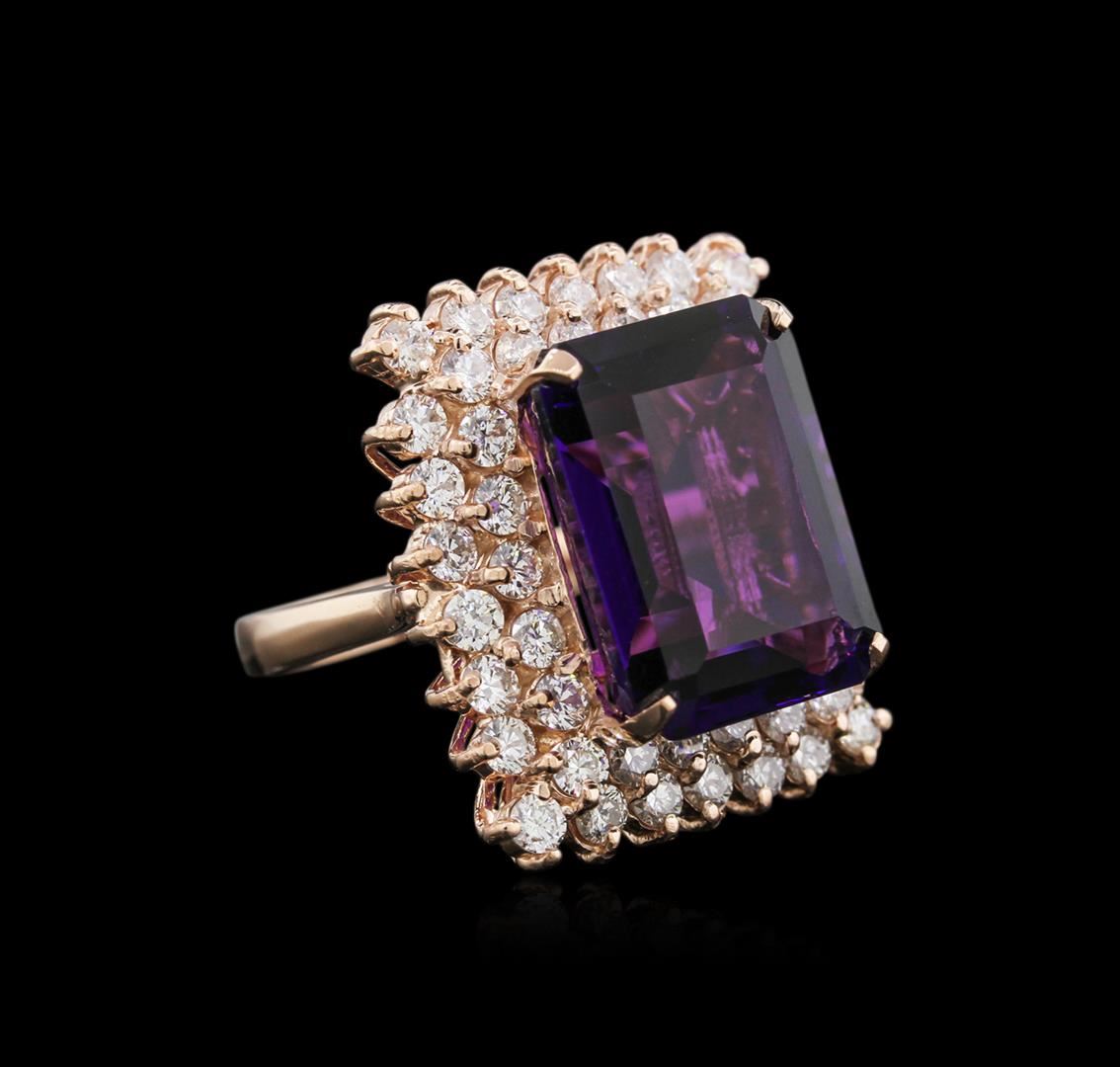One electronically tested 14KT rose gold ladies cast amethyst and diamond ring with a bright polish finish. Identified with markings of "14K". Condition is new. Containing: One prong set emerald standard step cut natural amethyst, measuring 16.00 x 12.00 x 7.80mm, approximate weight of 10.76ct., clarity is eye clean, type II, medium, moderately strong, purple color, (GIA P 5/4), cut is good. Forty-Eight prong set round brilliant cut diamonds, measuring 2.40 - 2.30 x 1.41mm (depth est.) approximate total weight of 48 Stones = 2.39ct. Clarity: VS-2 to SI-1. Color: I - J, Cut is Good. Colored gemstones are presumed to have been subjected to commonly used enhancement processes. All diamonds and colored gemstones are graded in the mounting, unless otherwise stated. Total Weight of Colored Stones 10.76ct. Total Weight of Diamonds 2.39ct. Total Weight of Ring 11.50 grams. GGL Appraised at $5,150.00.