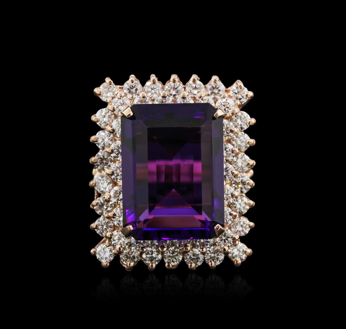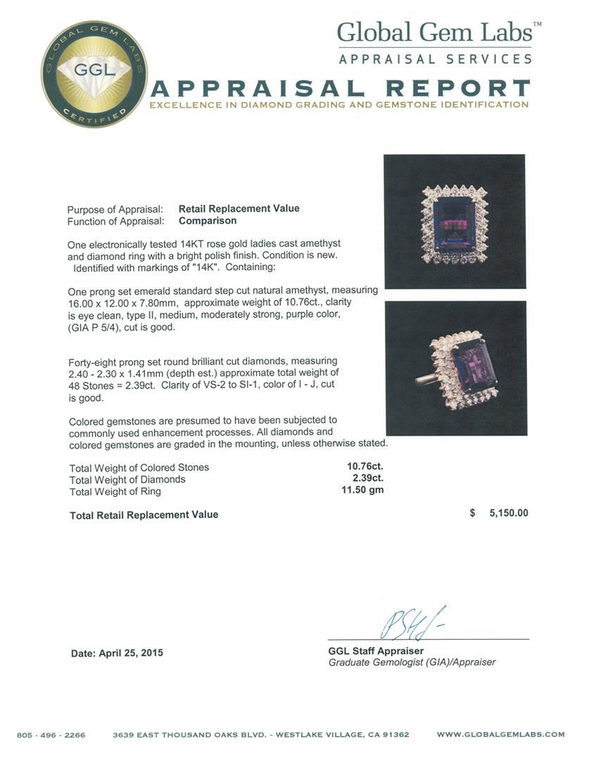 One electronically tested 14KT rose gold ladies cast amethyst and diamond ring with a bright polish finish. Identified with markings of "14K". Condition is new. Containing: One prong set emerald standard step cut natural amethyst, measuring 16.00 x 12.00 x 7.80mm, approximate weight of 10.76ct., clarity is eye clean, type II, medium, moderately strong, purple color, (GIA P 5/4), cut is good. Forty-Eight prong set round brilliant cut diamonds, measuring 2.40 - 2.30 x 1.41mm (depth est.) approximate total weight of 48 Stones = 2.39ct. Clarity: VS-2 to SI-1. Color: I - J, Cut is Good. Colored gemstones are presumed to have been subjected to commonly used enhancement processes. All diamonds and colored gemstones are graded in the mounting, unless otherwise stated. Total Weight of Colored Stones 10.76ct. Total Weight of Diamonds 2.39ct. Total Weight of Ring 11.50 grams. GGL Appraised at $5,150.00.