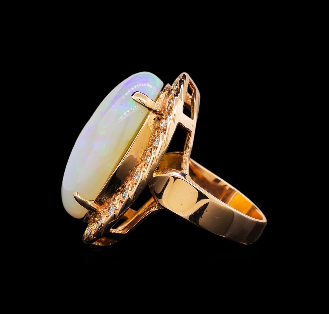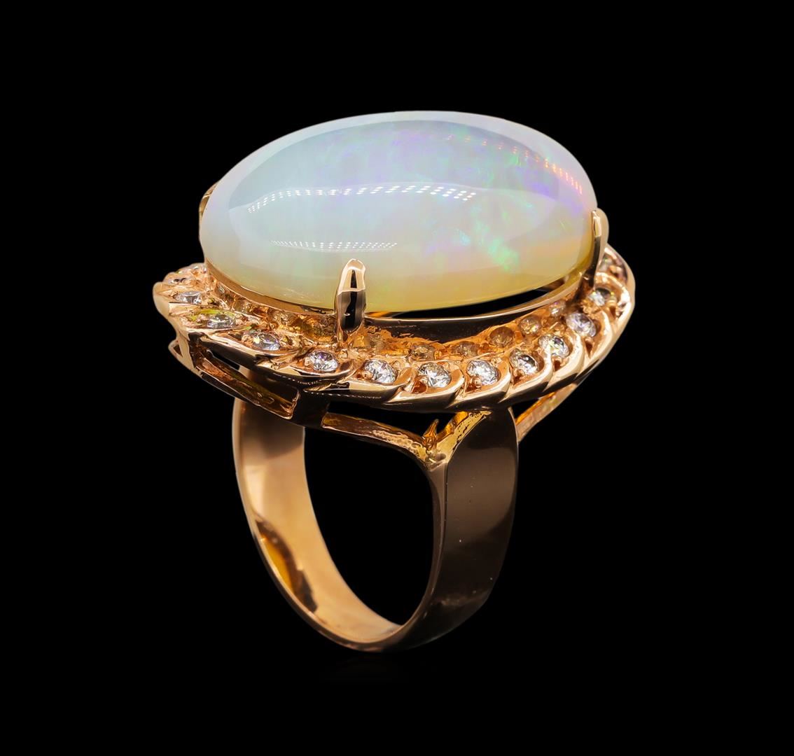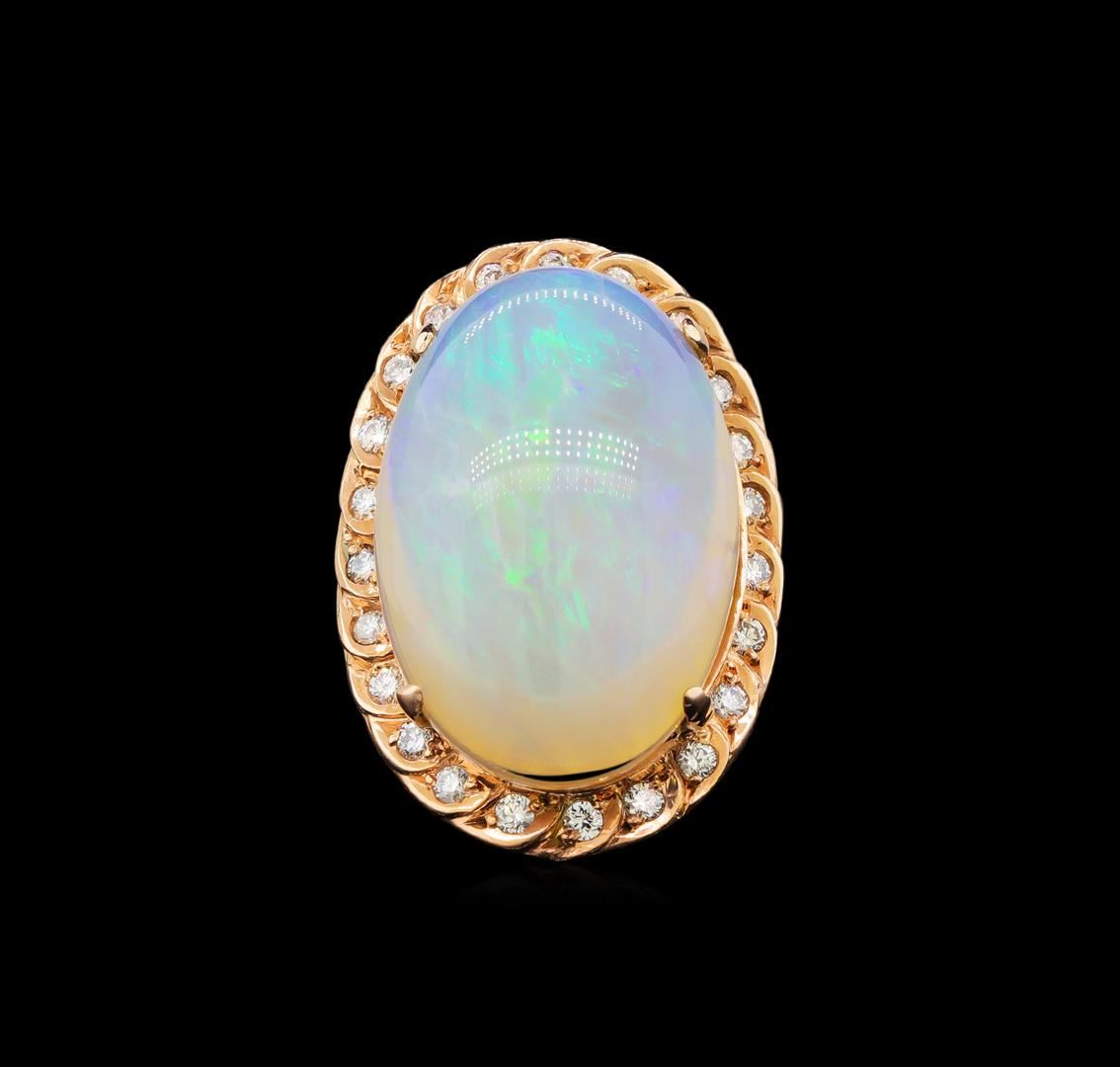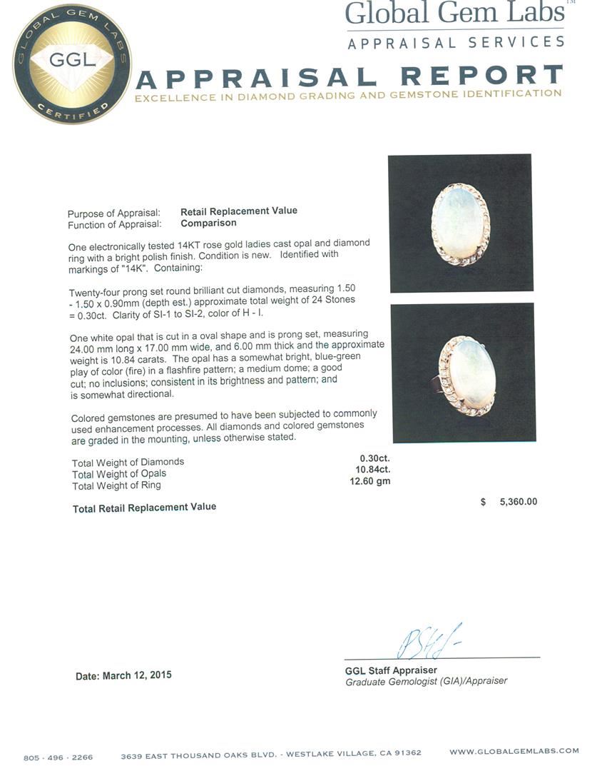 One electronically tested Gold-Rose-14KT ladies cast opal and diamond ring with a bright polish finish. Identified with markings of "14K". Condition is new. Containing: Twenty-Four prong set round brilliant cut diamonds, measuring 1.50 - 1.50 x 0.90mm (depth est.) approximate total weight of 24 Stones = 0.30ct. Clarity: SI-1 to SI-2. Color: H - I. One white opal that is cut in a oval shape and is prong set, measuring 24.00. mm long x 17.00. mm wide, and 6.00. mm thick and the approximate weight is 10.84 carats. The opal has a somewhat bright, blue-green play of color (fire) in a flashfire pattern; a medium dome; a good cut; no inclusions; consistent in its brightness and pattern; and is somewhat directional. Colored gemstones are presumed to have been subjected to commonly used enhancement processes. All diamonds and colored gemstones are graded in the mounting, unless otherwise stated. Total Weight of Diamonds 0.30ct. Total Weight of Opals 10.84ct. Total Weight of Ring 12.60 grams. GGL Appraised at $5,360.00.
