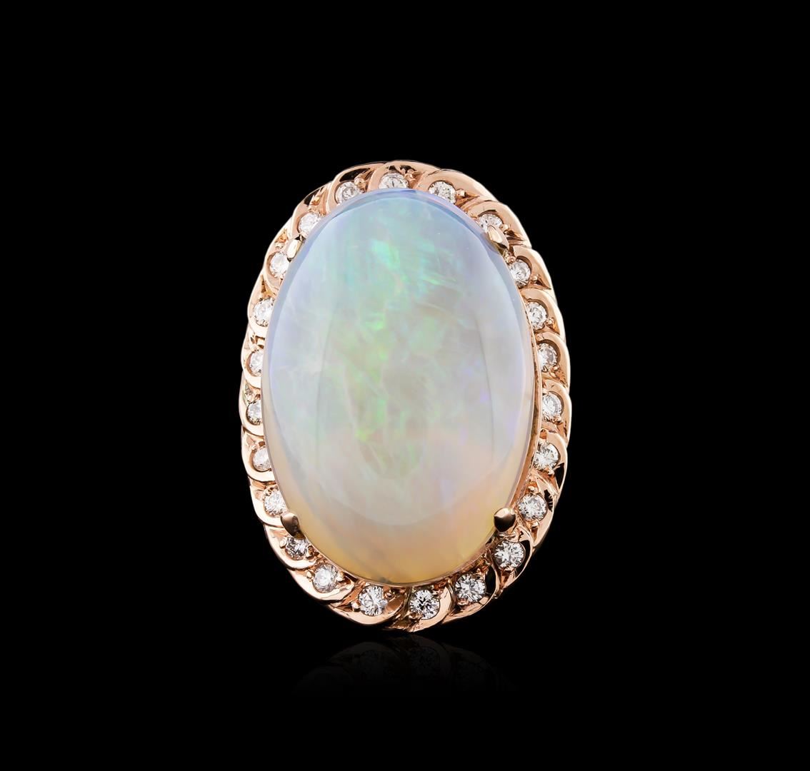 One electronically tested Gold-Rose-14KT ladies cast opal and diamond ring with a bright polish finish. Identified with markings of "14K". Condition is new. Containing: Twenty-Four prong set round brilliant cut diamonds, measuring 1.50 - 1.50 x 0.90mm (depth est.) approximate total weight of 24 Stones = 0.30ct. Clarity: SI-1 to SI-2. Color: H - I. One white opal that is cut in a oval shape and is prong set, measuring 24.00. mm long x 17.00. mm wide, and 6.00. mm thick and the approximate weight is 10.84 carats. The opal has a somewhat bright, blue-green play of color (fire) in a flashfire pattern; a medium dome; a good cut; no inclusions; consistent in its brightness and pattern; and is somewhat directional. Colored gemstones are presumed to have been subjected to commonly used enhancement processes. All diamonds and colored gemstones are graded in the mounting, unless otherwise stated. Total Weight of Diamonds 0.30ct. Total Weight of Opals 10.84ct. Total Weight of Ring 12.60 grams. GGL Appraised at $5,360.00.