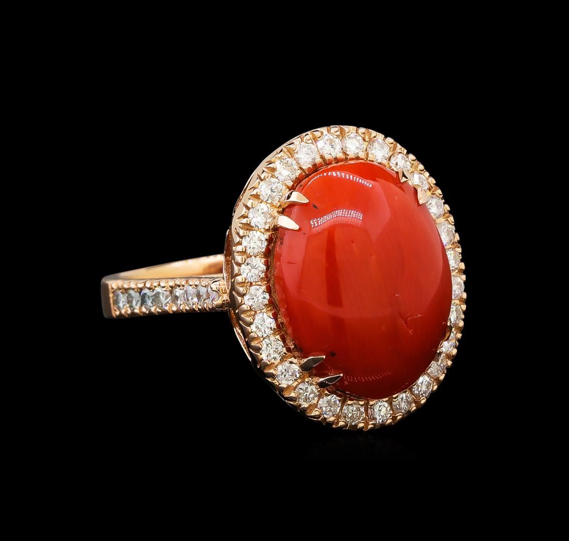 One electronically tested 14KT rose gold ladies cast coral and diamond ring with a bright polish finish. Identified with markings of "14K". Condition is new. Containing: One prong set oval cabochon cut natural red coral, measuring 15.80 x 12.20 x 7.93mm, approximate weight of 10.94ct., clarity is severely included, medium dark, brownish, red color, (GIA R 6/1), cut is good. Twenty-Nine prong set round brilliant cut diamonds, measuring 1.30 - 1.30 x 0.78mm (depth est.) approximate total weight of 29 Stones = 0.23ct. Clarity: I-1 to I-2. Color: H - I. Colored gemstones are presumed to have been subjected to commonly used enhancement processes. All diamonds and colored gemstones are graded in the mounting, unless otherwise stated. Total Weight of Colored Stones 10.94ct. Total Weight of Diamonds 0.23ct. Total Weight of Ring 8.20 grams. GGL Appraised at $3,285.00.