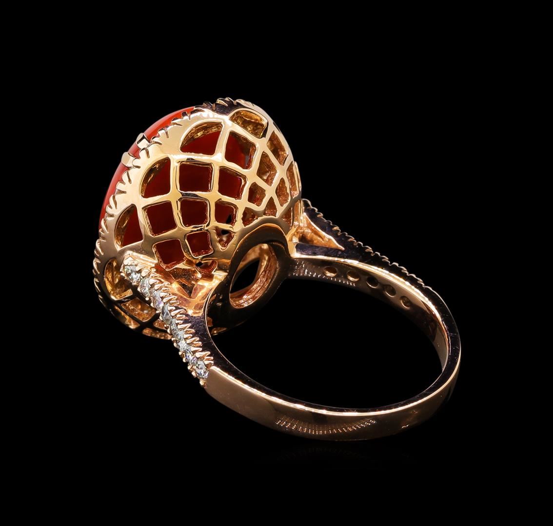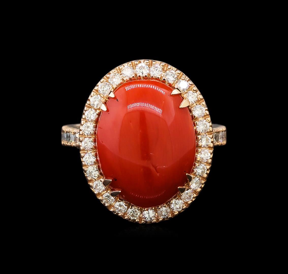 One electronically tested 14KT rose gold ladies cast coral and diamond ring with a bright polish finish. Identified with markings of "14K". Condition is new. Containing: One prong set oval cabochon cut natural red coral, measuring 15.80 x 12.20 x 7.93mm, approximate weight of 10.94ct., clarity is severely included, medium dark, brownish, red color, (GIA R 6/1), cut is good. Twenty-Nine prong set round brilliant cut diamonds, measuring 1.30 - 1.30 x 0.78mm (depth est.) approximate total weight of 29 Stones = 0.23ct. Clarity: I-1 to I-2. Color: H - I. Colored gemstones are presumed to have been subjected to commonly used enhancement processes. All diamonds and colored gemstones are graded in the mounting, unless otherwise stated. Total Weight of Colored Stones 10.94ct. Total Weight of Diamonds 0.23ct. Total Weight of Ring 8.20 grams. GGL Appraised at $3,285.00.