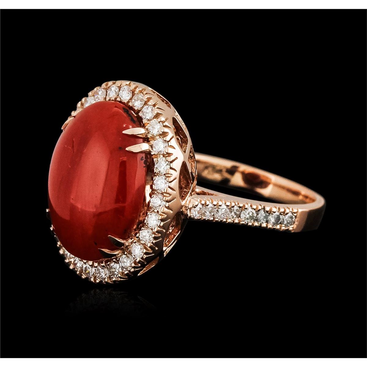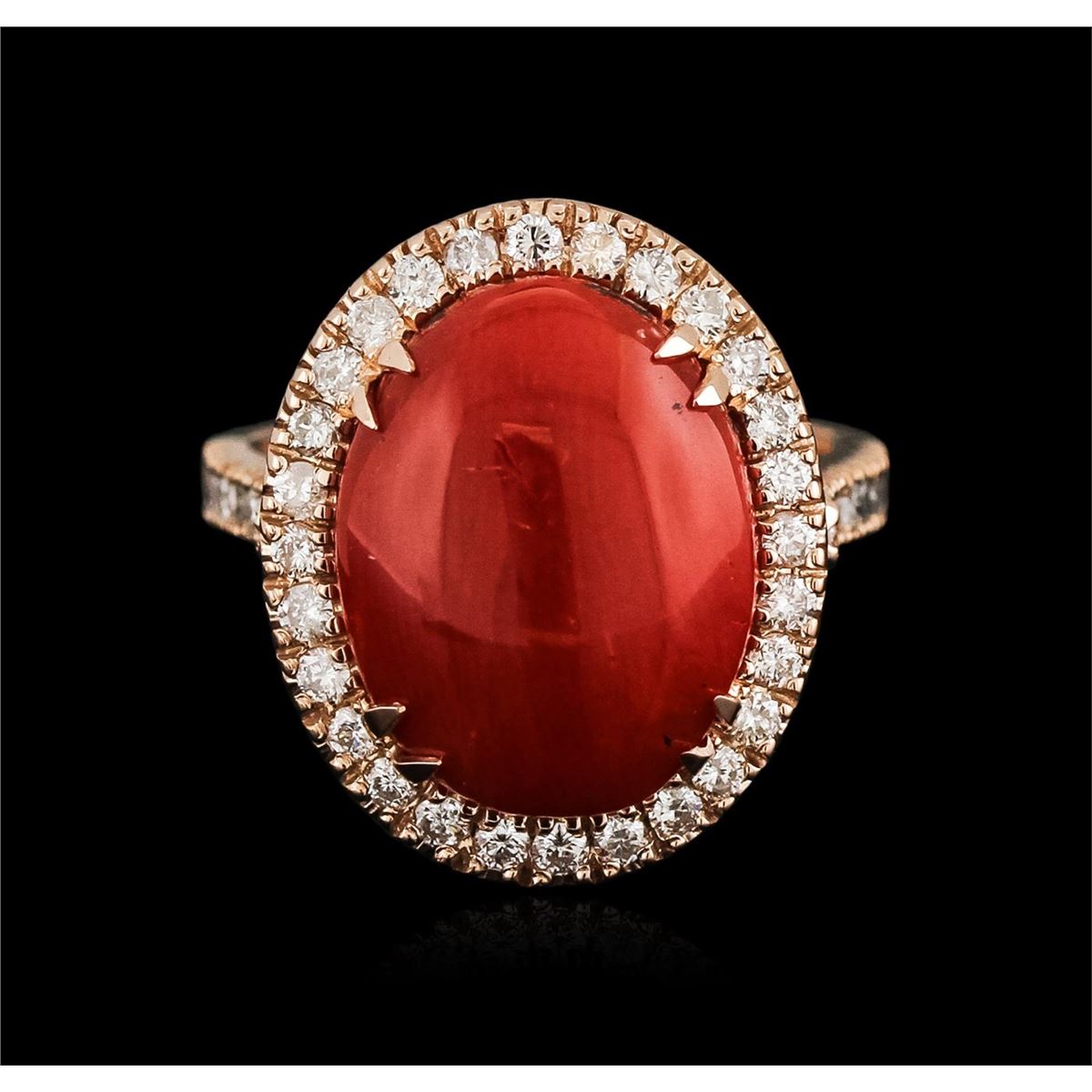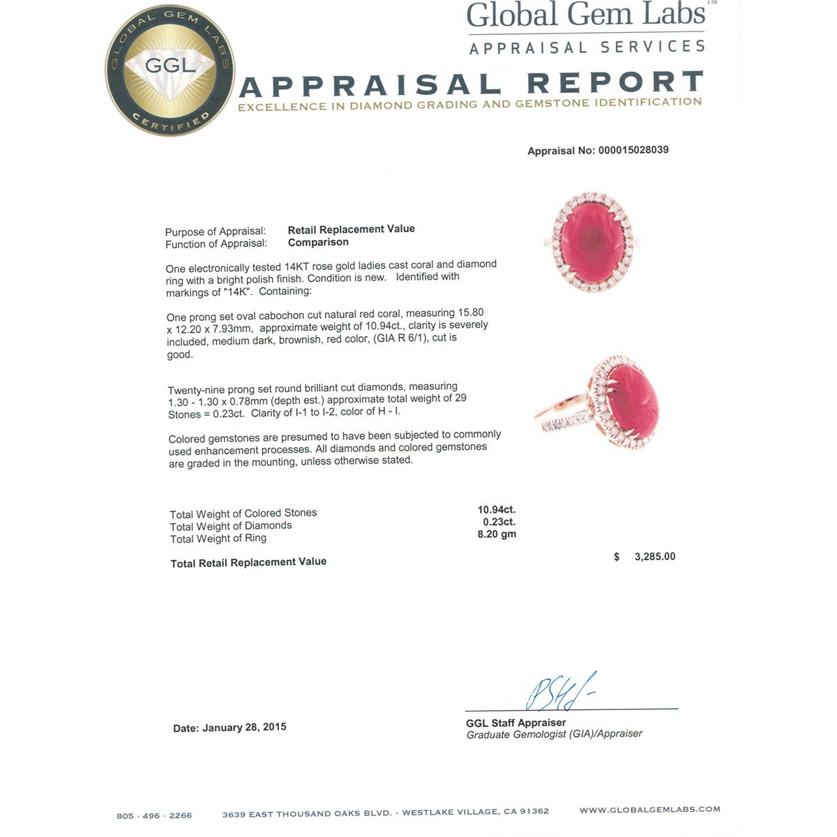 One electronically tested 14KT rose gold ladies cast coral and diamond ring with a bright polish finish. Identified with markings of "14K". Condition is new. Containing: One prong set oval cabochon cut natural red coral, measuring 15.80 x 12.20 x 7.93mm, approximate weight of 10.94ct., clarity is severely included, medium dark, brownish, red color, (GIA R 6/1), cut is good. Twenty-Nine prong set round brilliant cut diamonds, measuring 1.30 - 1.30 x 0.78mm (depth est.) approximate total weight of 29 Stones = 0.23ct. Clarity: I-1 to I-2. Color: H - I. Colored gemstones are presumed to have been subjected to commonly used enhancement processes. All diamonds and colored gemstones are graded in the mounting, unless otherwise stated. Total Weight of Colored Stones 10.94ct. Total Weight of Diamonds 0.23ct. Total Weight of Ring 8.20 grams. GGL Appraised at $3,285.00.