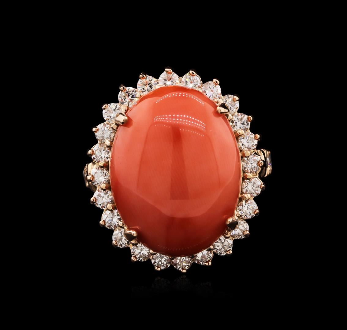 One electronically tested 14KT rose gold ladies cast coral and diamond ring with a bright polish finish. Identified with markings of "14K". Condition is new. Containing: One prong set oval cabochon cut natural pink coral, measuring 19.00 x 16.00 x 6.67mm, approximate weight of 11.16ct., clarity is severely included, light, moderately strong, pink color, (GIA Pk 3/4), cut is good. Thirty-Two prong set round brilliant cut diamonds, measuring 2.10 - 2.10 x 1.26mm (depth est.) approximate total weight of 32 Stones = 1.43ct. Clarity: SI-2 to I-1. Color: I - J, Cut is Good. Colored gemstones are presumed to have been subjected to commonly used enhancement processes. All diamonds and colored gemstones are graded in the mounting, unless otherwise stated. Total Weight of Colored Stones 11.16ct. Total Weight of Diamonds 1.43ct. Total Weight of Ring 9.20 grams. GGL Appraised at $5,360.00.