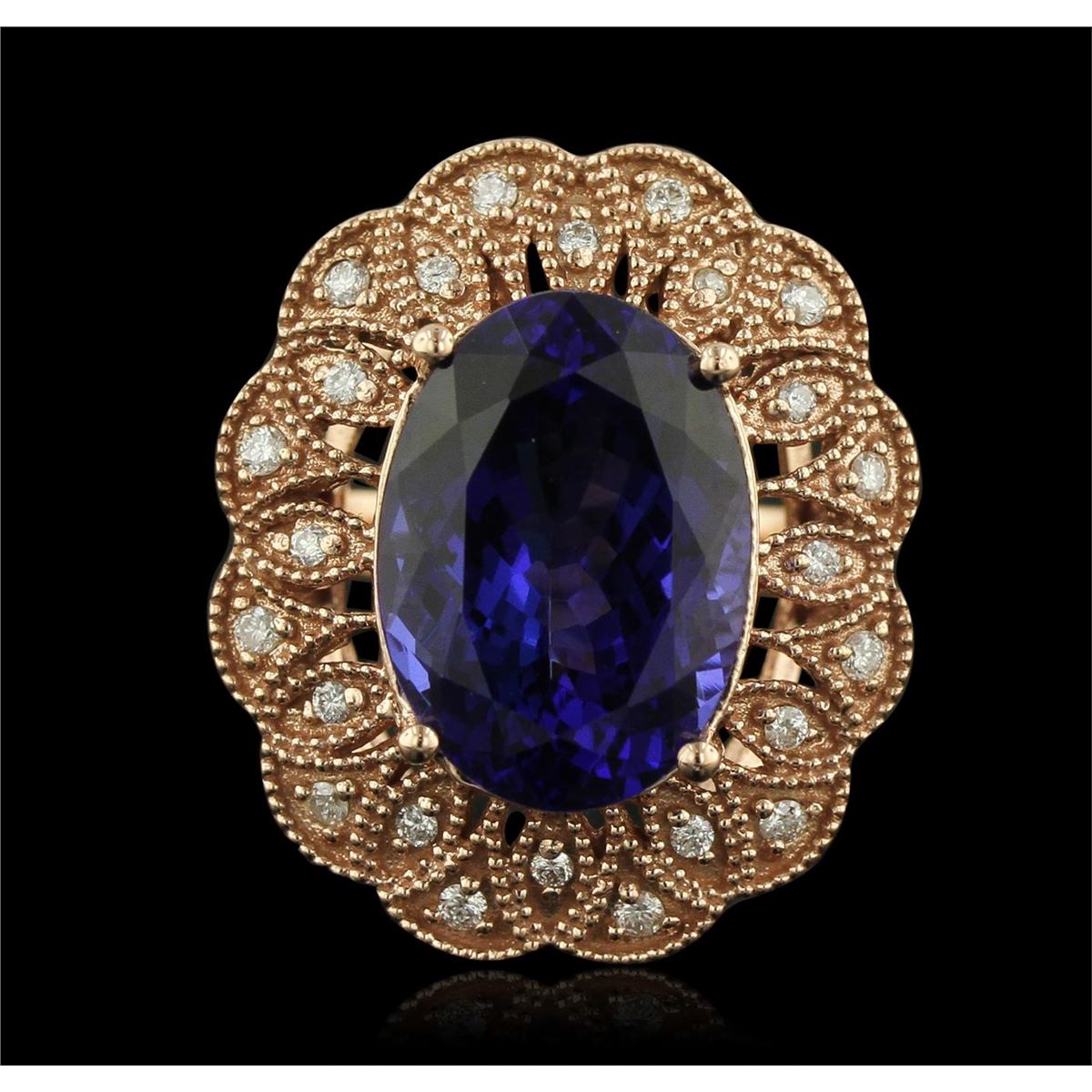 One electronically tested 14KT rose gold Ladies combination cast & assembled ring with a high polish finish. Condition is new. Identified with markings of "K14". Containing: One prong set oval modified mixed cut natural tanzanite, measuring 16.00 x 12.00 x 6.90mm, approximate weight of 11.28ct., clarity is eye clean, type I, medium, moderately strong, violetish blue color, (GIA vB 5/4), cut is very good. Colored gemstones are presumed to have been subjected to commonly used color/clarity enhancement processes. Twenty-Four prong set round brilliant cut diamonds, measuring 1.30 - 1.30 x 0.78mm (depth est.) approximate. Total Weight of 24 Stones = 0.30ct. Clarity: SI-1 to I-1. Color: G - H, Cut is Good. Total Weight of Colored Stones 11.28ct. Total Weight of Diamonds 0.30ct. Total Weight of Ring 12.70 grams. GGL Appraised at $19,945.00.