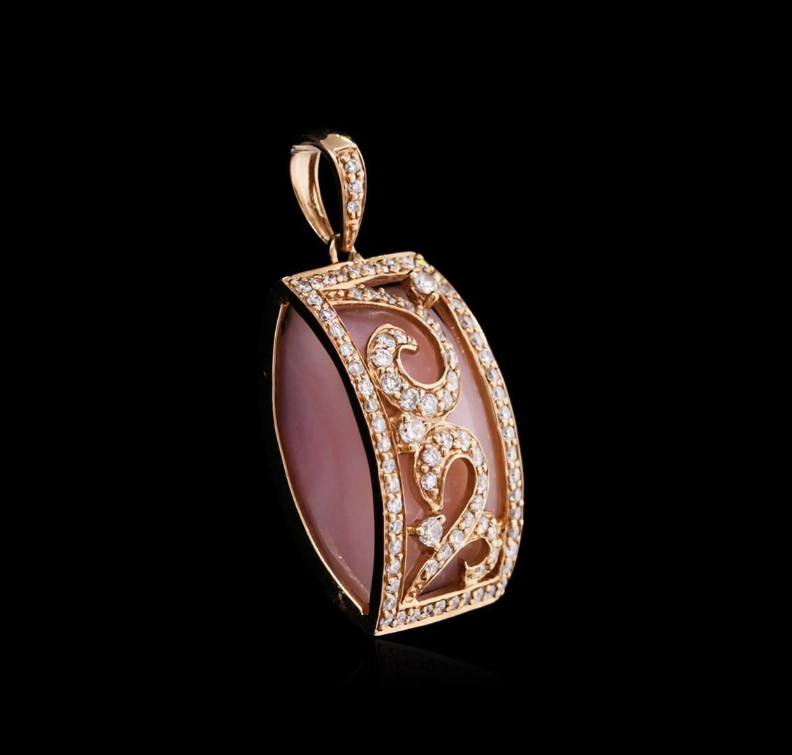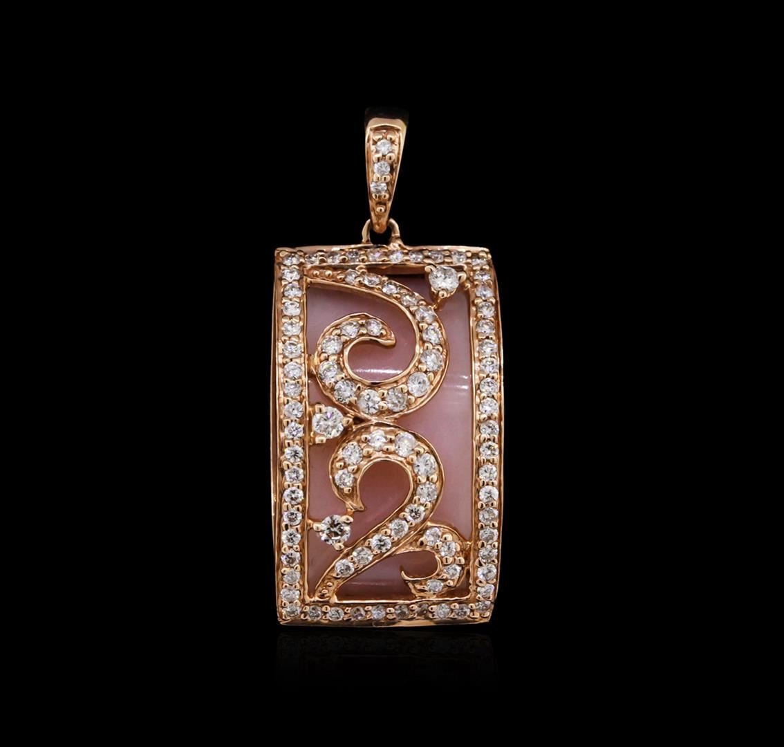 One pendant featuring: 14KT rose gold weighing 2.95 grams containing one pink opal with a total weight of 11.43ct and 90 round diamonds with a total weight of 0.57ct.