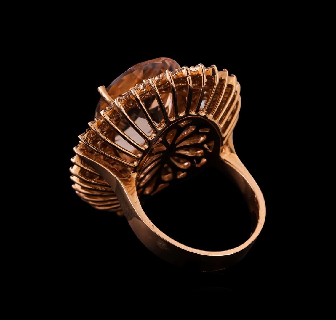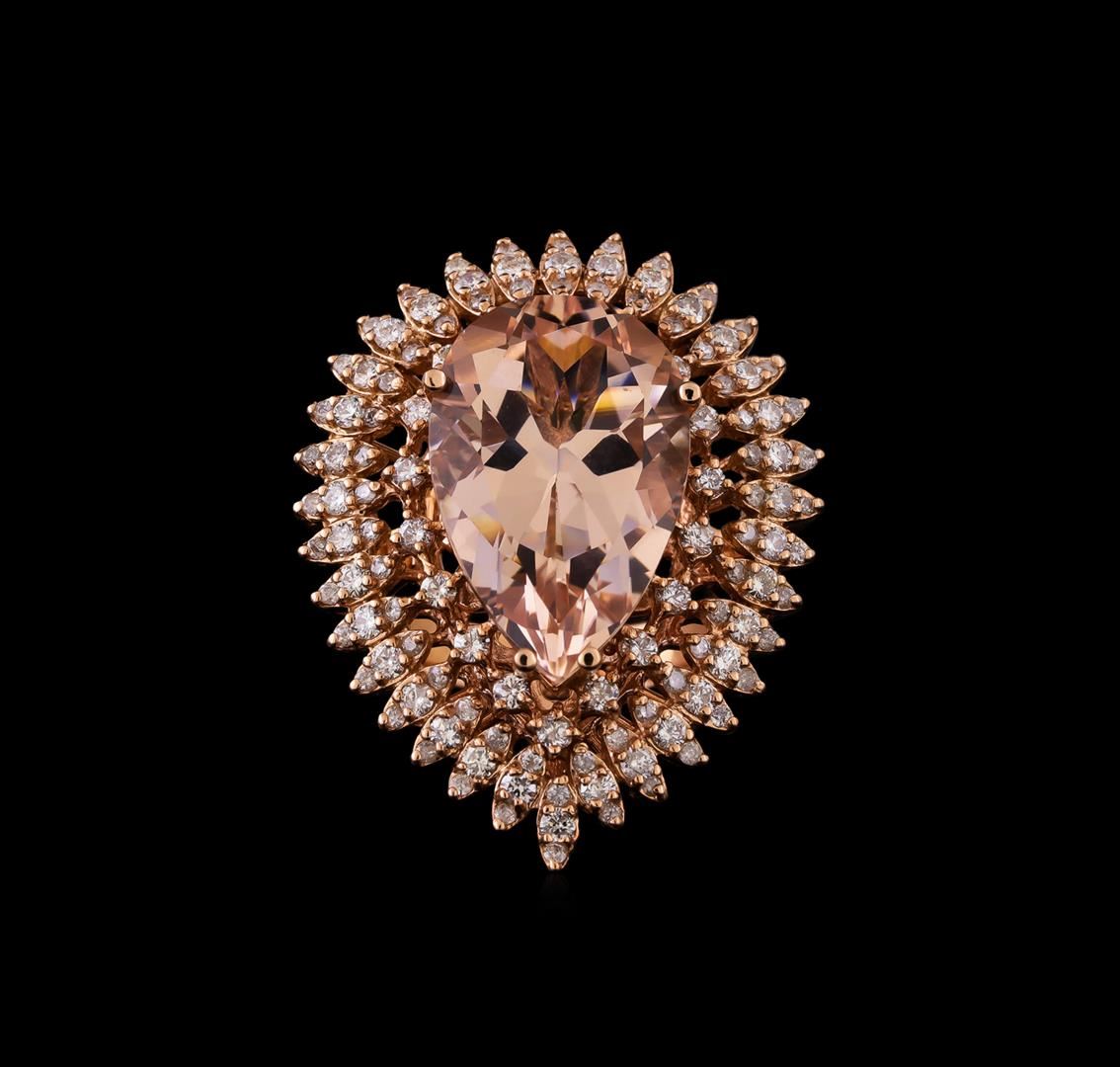 One electronically tested 14KT rose gold ladies cast morganite and diamond ring with a bright polish finish. Identified with markings of "14K". Condition is new. Containing: One prong set pear modified brilliant cut natural morganite, measuring 19.89 x 12.83 x 8.34mm, approximate weight of 11.58ct., clarity is eye clean, type I, light, brownish, reddish orange color, (GIA rO 3/1), cut is good. One Hundred Ten prong set round brilliant cut diamonds, measuring 1.50 - 1.10 x 0.78mm (depth est.) approximate total weight of 110 Stones = 0.88ct. Clarity: SI-2 to I-1. Color: I - J, Cut is Good. Colored gemstones are presumed to have been subjected to commonly used enhancement processes. All diamonds and colored gemstones are graded in the mounting, unless otherwise stated. Total Weight of Colored Stones 11.58ct. Total Weight of Diamonds 0.88ct. Total Weight of Ring 13.90 grams. GGL Appraised at $7,695.00.
