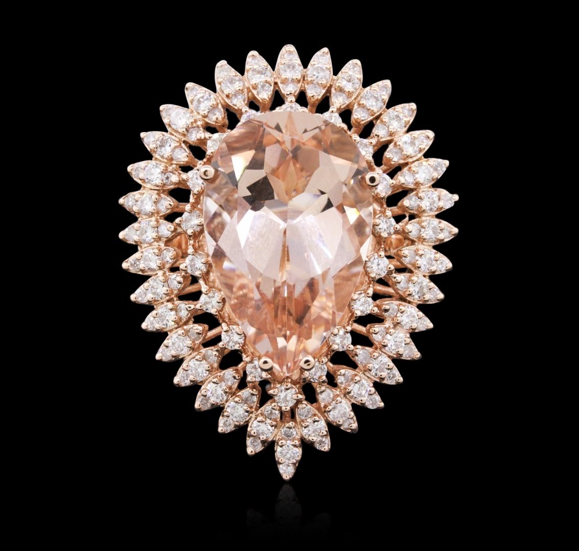 One electronically tested 14KT rose gold ladies cast morganite and diamond ring with a bright polish finish. Identified with markings of "14K". Condition is new. Containing: One prong set pear modified brilliant cut natural morganite, measuring 19.89 x 12.83 x 8.34mm, approximate weight of 11.58ct., clarity is eye clean, type I, light, brownish, reddish orange color, (GIA rO 3/1), cut is good. One Hundred Ten prong set round brilliant cut diamonds, measuring 1.50 - 1.10 x 0.78mm (depth est.) approximate total weight of 110 Stones = 0.88ct. Clarity: SI-2 to I-1. Color: I - J, Cut is Good. Colored gemstones are presumed to have been subjected to commonly used enhancement processes. All diamonds and colored gemstones are graded in the mounting, unless otherwise stated. Total Weight of Colored Stones 11.58ct. Total Weight of Diamonds 0.88ct. Total Weight of Ring 13.90 grams. GGL Appraised at $7,695.00.