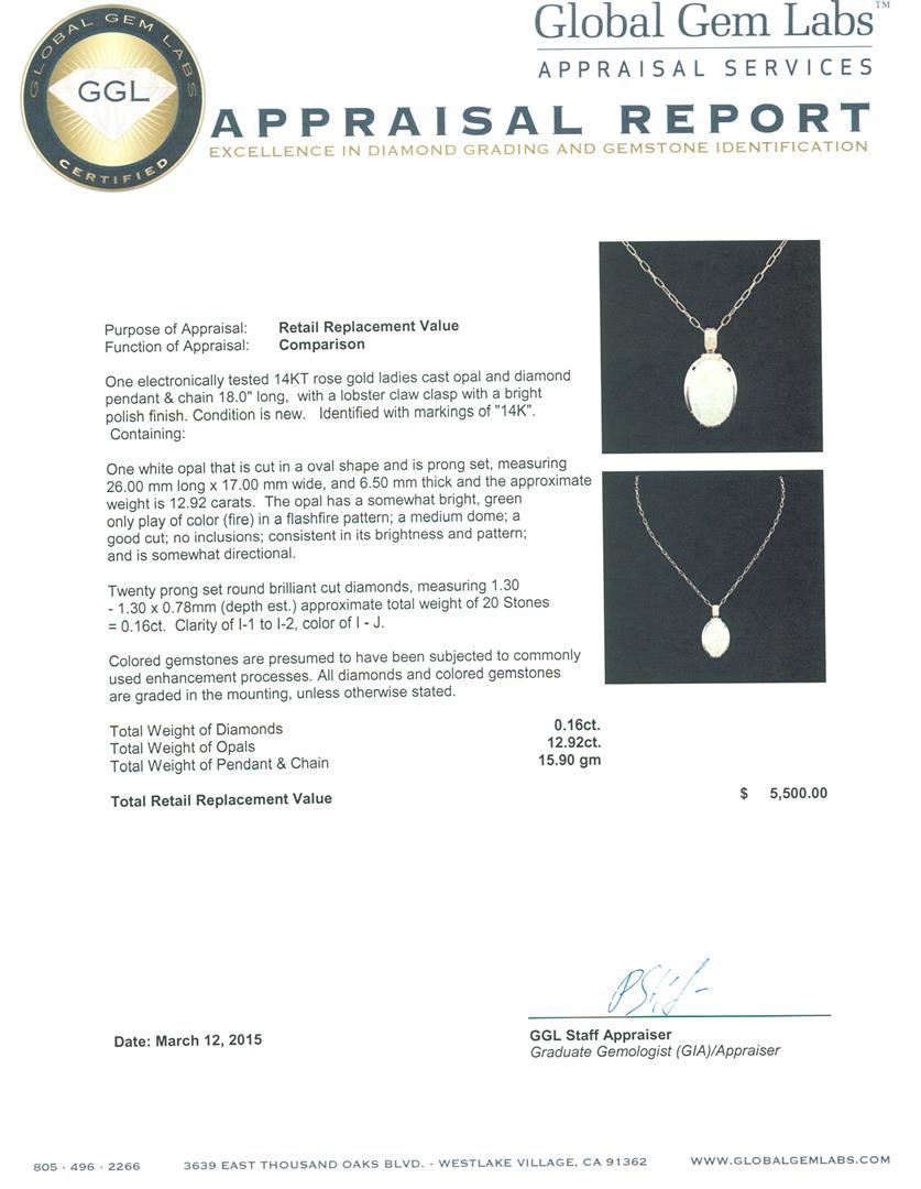 One electronically tested Gold-Rose-14KT ladies cast opal and diamond pendant & chain 18.0" long, with a lobster claw clasp with a bright polish finish. Identified with markings of "14K". Condition is new. Containing: One white opal that is cut in a oval shape and is prong set, measuring 26.00. mm long x 17.00. mm wide, and 6.50 mm thick and the approximate weight is 12.92 carats. The opal has a somewhat bright, green only play of color (fire) in a flashfire pattern; a medium dome; a good cut; no inclusions; consistent in its brightness and pattern; and is somewhat directional. Twenty prong set round brilliant cut diamonds, measuring 1.30 - 1.30 x 0.78mm (depth est.) approximate total weight of 20 Stones = 0.16ct. Clarity: I-1 to I-2. Color: I - J. Colored gemstones are presumed to have been subjected to commonly used enhancement processes. All diamonds and colored gemstones are graded in the mounting, unless otherwise stated. Total Weight of Diamonds 0.16ct. Total Weight of Opals 12.92ct. Total Weight of Pendant & Chain 15.90 grams. GGL Appraised at $5,500.00.