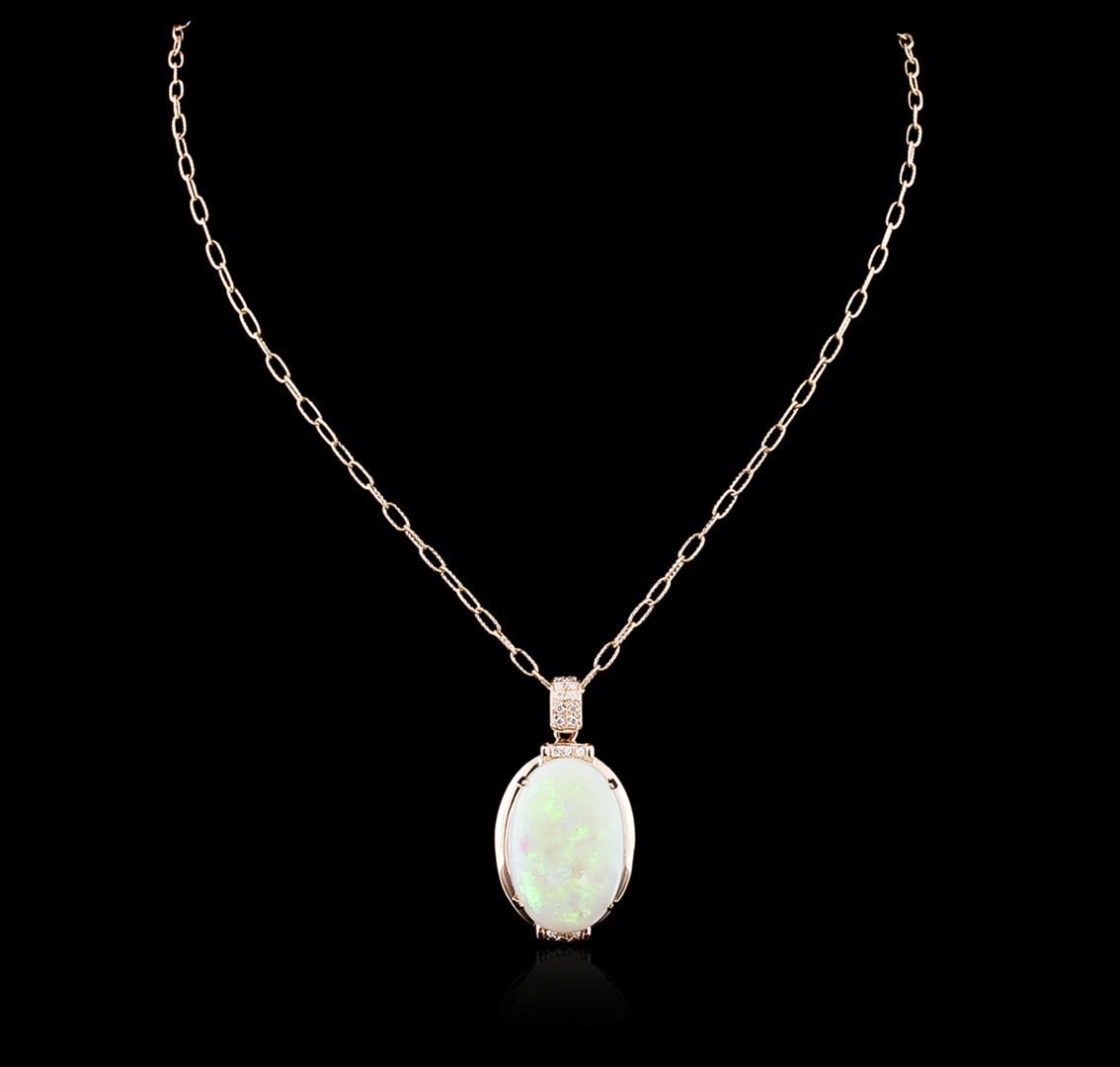 One electronically tested Gold-Rose-14KT ladies cast opal and diamond pendant & chain 18.0" long, with a lobster claw clasp with a bright polish finish. Identified with markings of "14K". Condition is new. Containing: One white opal that is cut in a oval shape and is prong set, measuring 26.00. mm long x 17.00. mm wide, and 6.50 mm thick and the approximate weight is 12.92 carats. The opal has a somewhat bright, green only play of color (fire) in a flashfire pattern; a medium dome; a good cut; no inclusions; consistent in its brightness and pattern; and is somewhat directional. Twenty prong set round brilliant cut diamonds, measuring 1.30 - 1.30 x 0.78mm (depth est.) approximate total weight of 20 Stones = 0.16ct. Clarity: I-1 to I-2. Color: I - J. Colored gemstones are presumed to have been subjected to commonly used enhancement processes. All diamonds and colored gemstones are graded in the mounting, unless otherwise stated. Total Weight of Diamonds 0.16ct. Total Weight of Opals 12.92ct. Total Weight of Pendant & Chain 15.90 grams. GGL Appraised at $5,500.00.