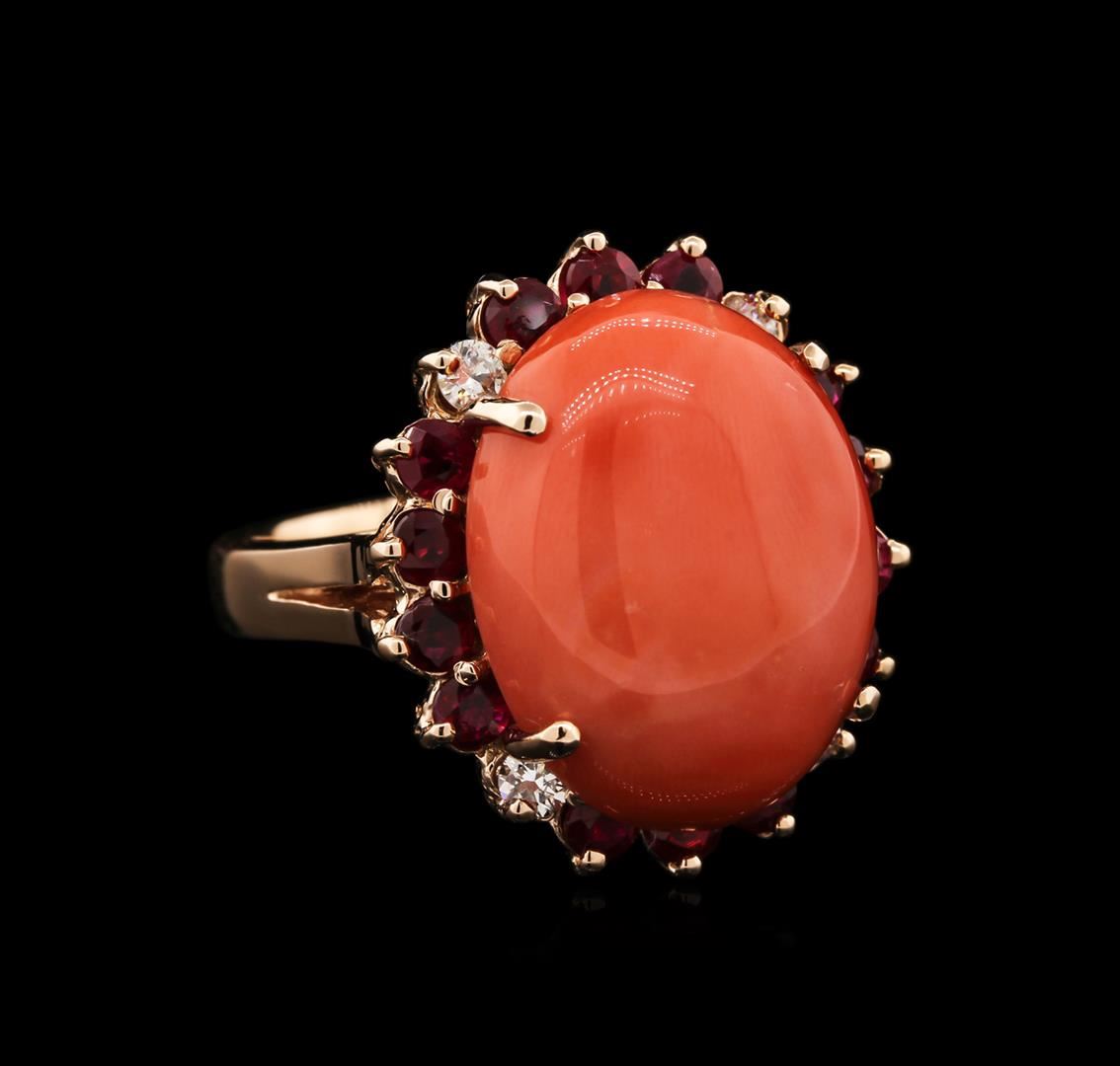 One electronically tested 14KT rose gold ladies cast coral, ruby and diamond ring with a bright polish finish. Identified with markings of "14K". Condition is new. Containing: One prong set oval cabochon cut natural pink coral, measuring 19.00 x 16.50 x 6.88mm, approximate weight of 13.08ct., clarity is severely included, light, very slightly grayish, pink color, (GIA Pk 3/3), cut is good. Fourteen prong set round modified brilliant cut natural rubies, measuring 3.00 - 3.00 x 1.95 mm, approximate total weight of 1.64ct., clarity is slightly included, type II, medium dark, very slightly brownish, strongly purplish red color, (GIA stpR 6/3), cut is good. Four prong set round brilliant cut diamonds, measuring 3.00 - 3.00 x 1.80mm (depth est.) approximate total weight of 4 Stones = 0.30ct. Clarity: SI-2. Color: G - H, Cut is Good. Colored gemstones are presumed to have been subjected to commonly used enhancement processes. All diamonds and colored gemstones are graded in the mounting, unless otherwise stated. Total Weight of Colored Stones 14.72ct. Total Weight of Diamonds 0.30ct. Total Weight of Ring 11.30 grams. GGL Appraised at $4,620.00.