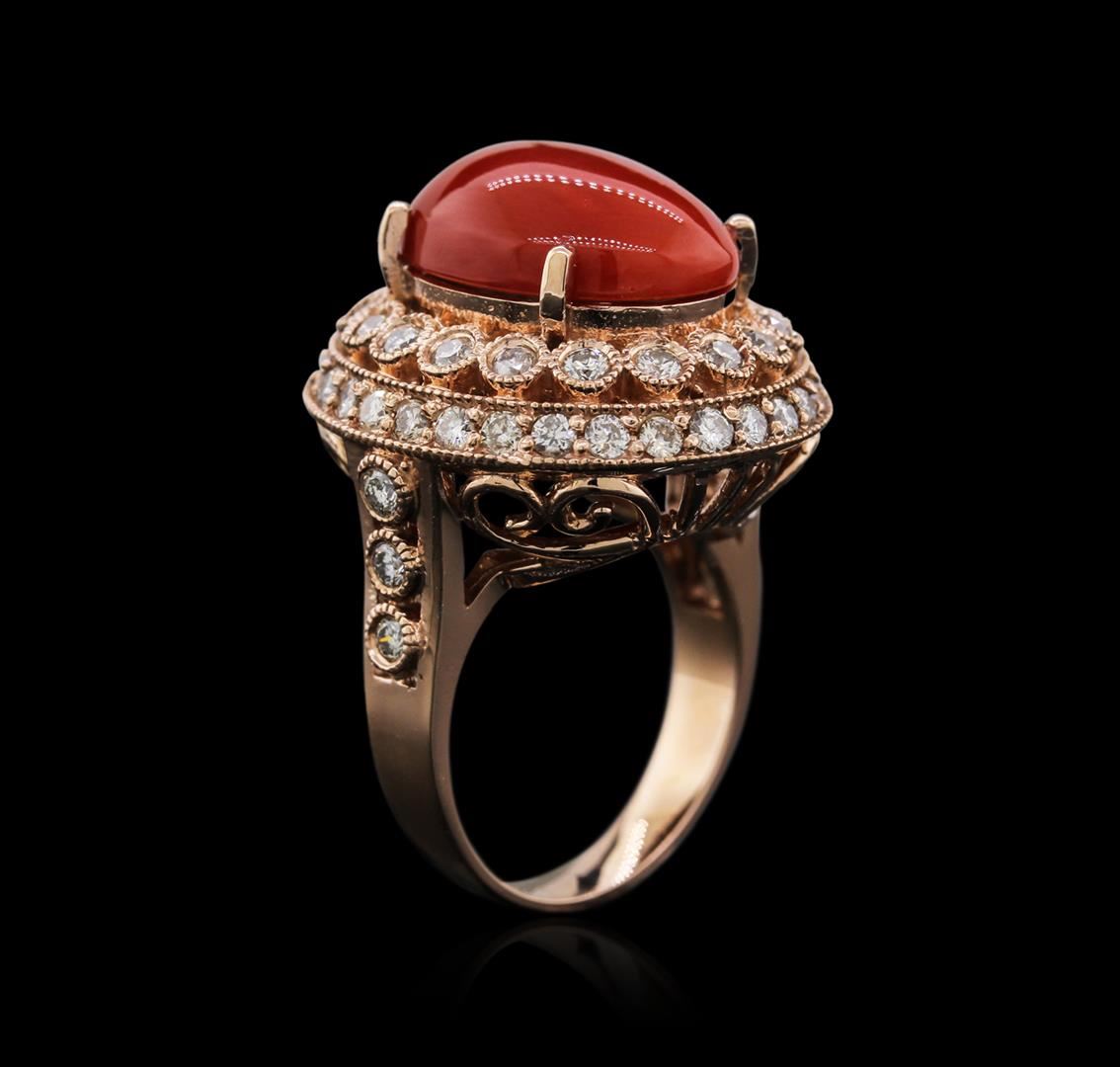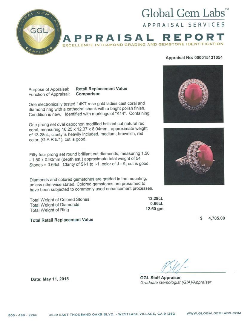 One electronically tested 14KT rose gold ladies cast coral and diamond ring with a cathedral shank with a bright polish finish. Identified with markings of "K14". Condition is new. Containing: One prong set oval cabochon modified brilliant cut natural red GGL Appraised at $4,785.00.