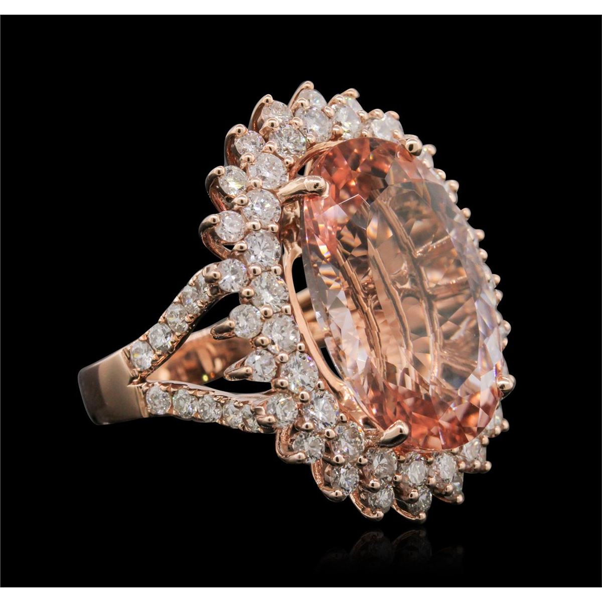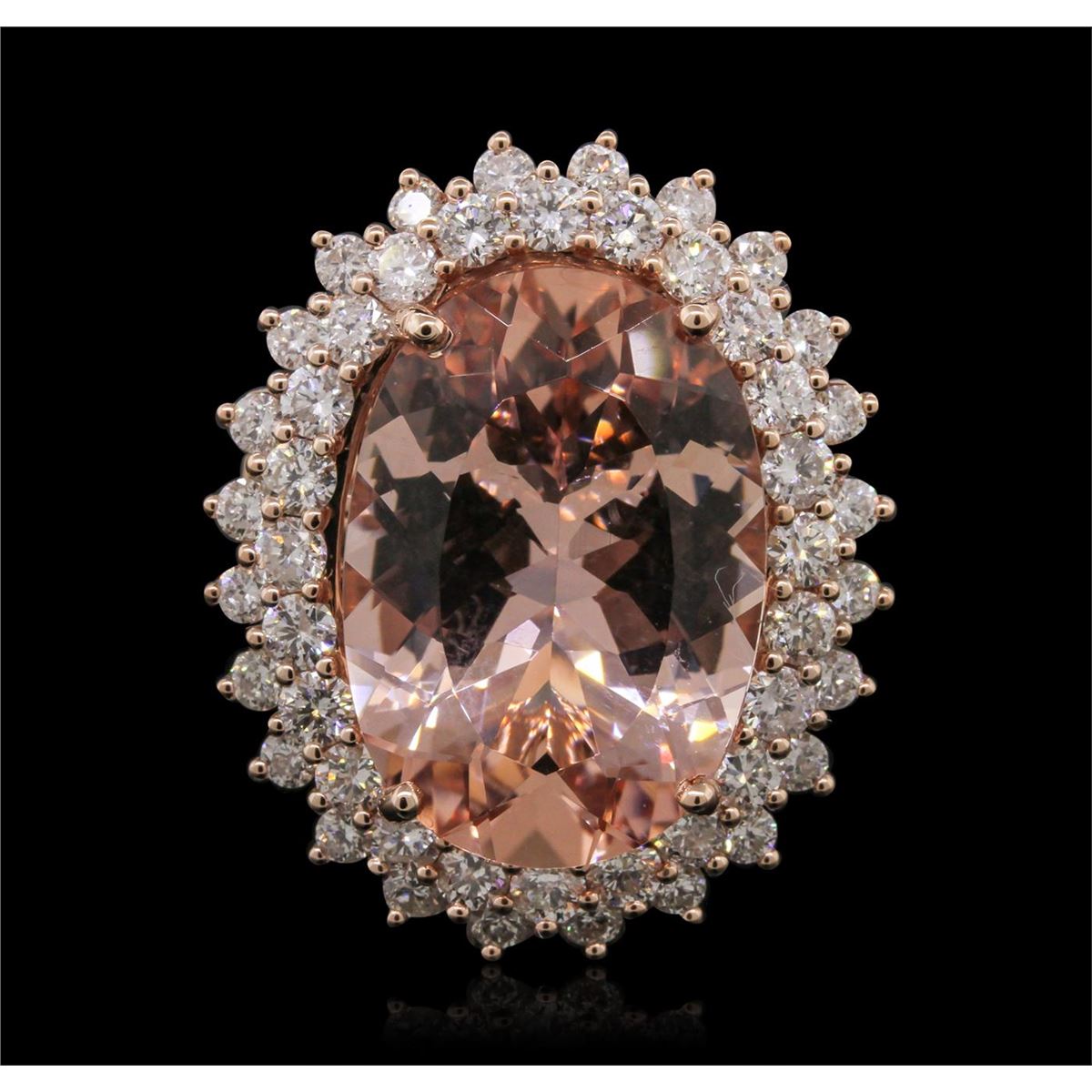 One electronically tested 14KT rose gold Ladies combination cast & assembled fashion ring with a bright polish finish. Condition is new. Identified with markings of "14K". Containing: One prong set oval modified mixed cut natural morganite, measuring 20.00 x 14.00 x 8.65mm, approximate weight of 13.41ct., clarity is eye clean, type I, light, slightly brownish, red orange color, (GIA RO 3/2), cut is very good. Colored gemstones are presumed to have been subjected to commonly used and possible undetectable color/clarity enhancement processes. Twenty prong set round brilliant cut diamonds, measuring 2.00 - 2.00 x 1.20mm (depth est.) approximate. Total Weight of 20 Stones = 0.25ct. Clarity: SI-1 to SI-2. Color: G, Cut is Good. Forty-Eight prong set round brilliant cut diamonds, measuring 2.50 - 2.50 x 1.50mm (depth est.) approximate. Total Weight of 48 Stones = 2.74ct. Clarity: SI-1 to SI-2. Color: H - I, Cut is Good. Total Weight of Colored Stones 13.41ct. Total Weight of Diamonds 2.99ct. Total Weight of Ring 11.10 grams. GGL Appraised at $16,040.00.