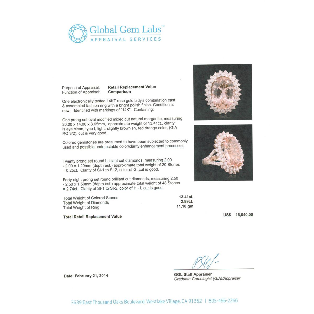 One electronically tested 14KT rose gold Ladies combination cast & assembled fashion ring with a bright polish finish. Condition is new. Identified with markings of "14K". Containing: One prong set oval modified mixed cut natural morganite, measuring 20.00 x 14.00 x 8.65mm, approximate weight of 13.41ct., clarity is eye clean, type I, light, slightly brownish, red orange color, (GIA RO 3/2), cut is very good. Colored gemstones are presumed to have been subjected to commonly used and possible undetectable color/clarity enhancement processes. Twenty prong set round brilliant cut diamonds, measuring 2.00 - 2.00 x 1.20mm (depth est.) approximate. Total Weight of 20 Stones = 0.25ct. Clarity: SI-1 to SI-2. Color: G, Cut is Good. Forty-Eight prong set round brilliant cut diamonds, measuring 2.50 - 2.50 x 1.50mm (depth est.) approximate. Total Weight of 48 Stones = 2.74ct. Clarity: SI-1 to SI-2. Color: H - I, Cut is Good. Total Weight of Colored Stones 13.41ct. Total Weight of Diamonds 2.99ct. Total Weight of Ring 11.10 grams. GGL Appraised at $16,040.00.