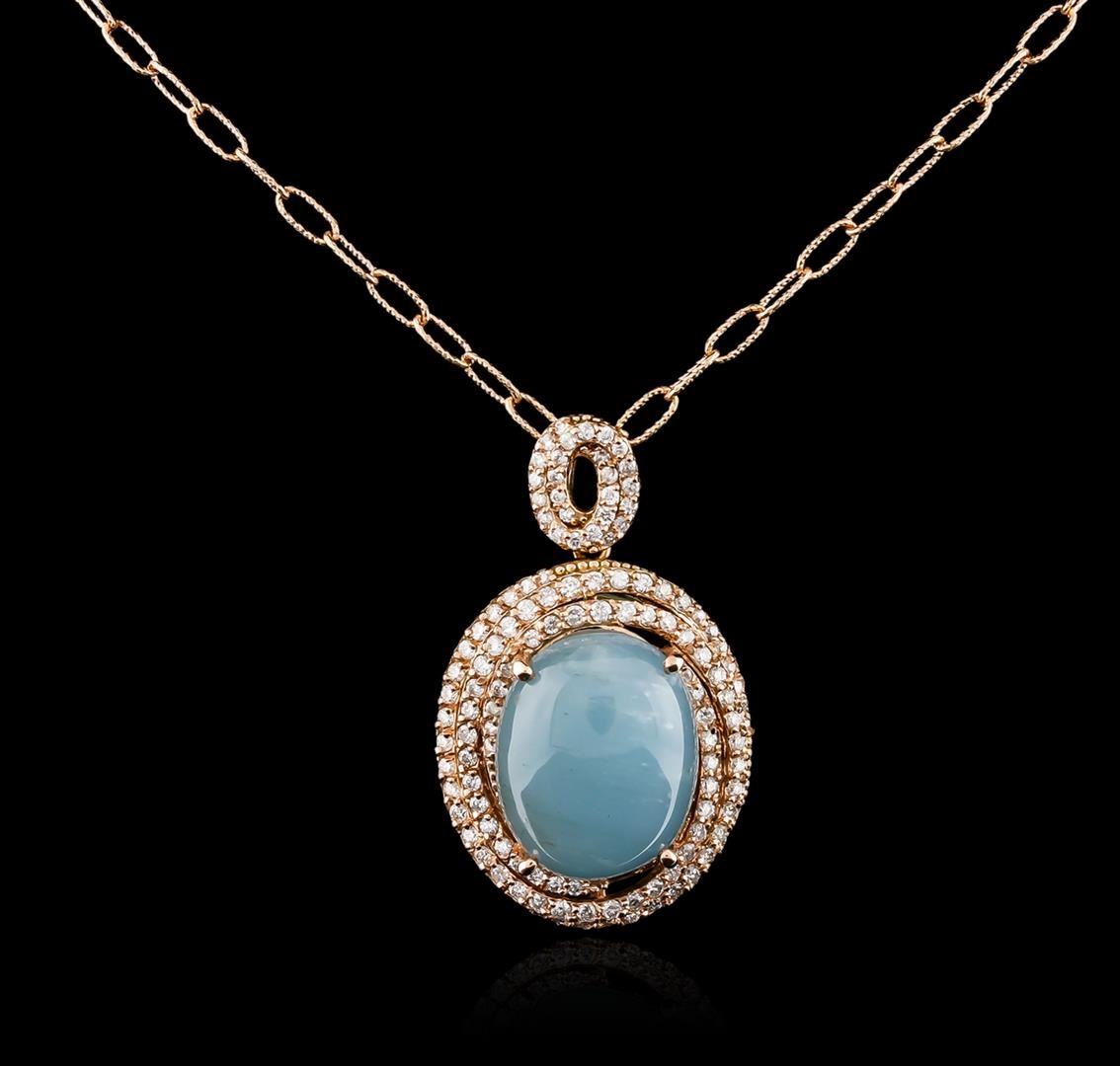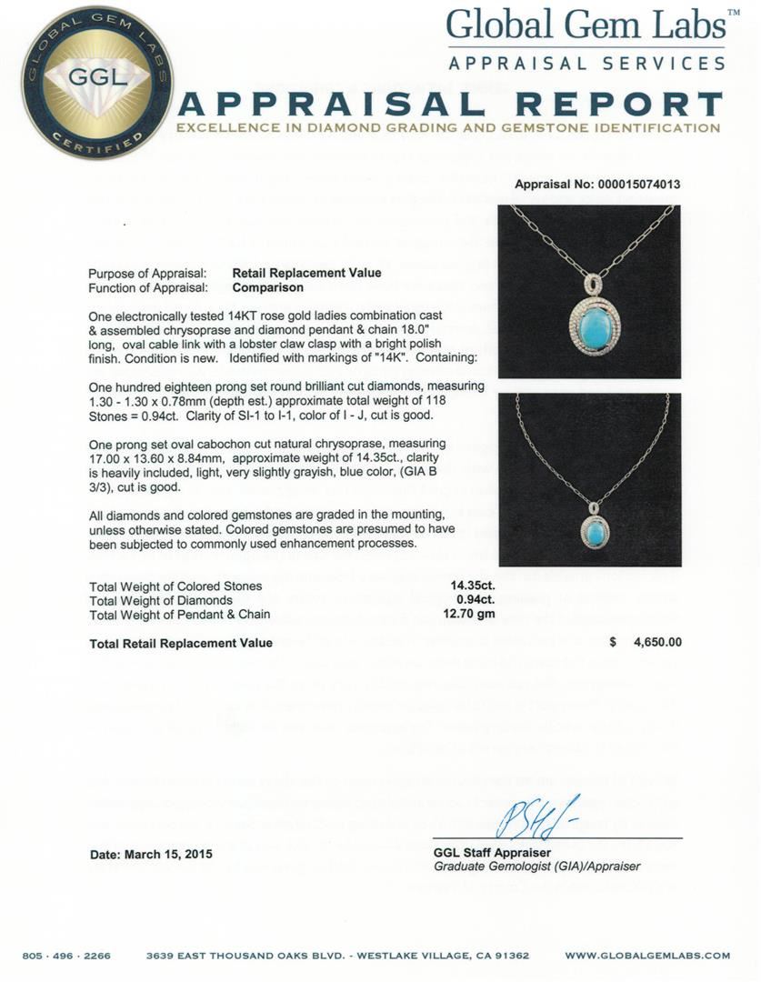 One electronically tested 14KT rose gold ladies combination cast & assembled chrysoprase and diamond pendant & chain 18.0" long, oval cable link with a lobster claw clasp with a bright polish finish. Identified with markings of "14K". Condition is new. Containing: One Hundred Eighteen prong set round brilliant cut diamonds, measuring 1.30 - 1.30 x 0.78mm (depth est.) approximate total weight of 118 Stones = 0.94ct. Clarity of SI-1 to I-1, Color of I - J, Cut is Good. One prong set oval cabochon cut natural chrysoprase, measuring 17.00 x 13.60 x 8.84mm, approximate weight of 14.35ct., clarity is heavily included, light, very slightly grayish, blue color, (GIA B 3/3), cut is good. All diamonds and colored gemstones are graded in the mounting, unless otherwise stated. Colored gemstones are presumed to have been subjected to commonly used enhancement processes. Total eight of Colored Stones 14.35ct. Total Weight of Diamonds 0.94ct. Total Weight of Pendant & Chain 12.70 grams. GGL Appraised at $4,650.00.
