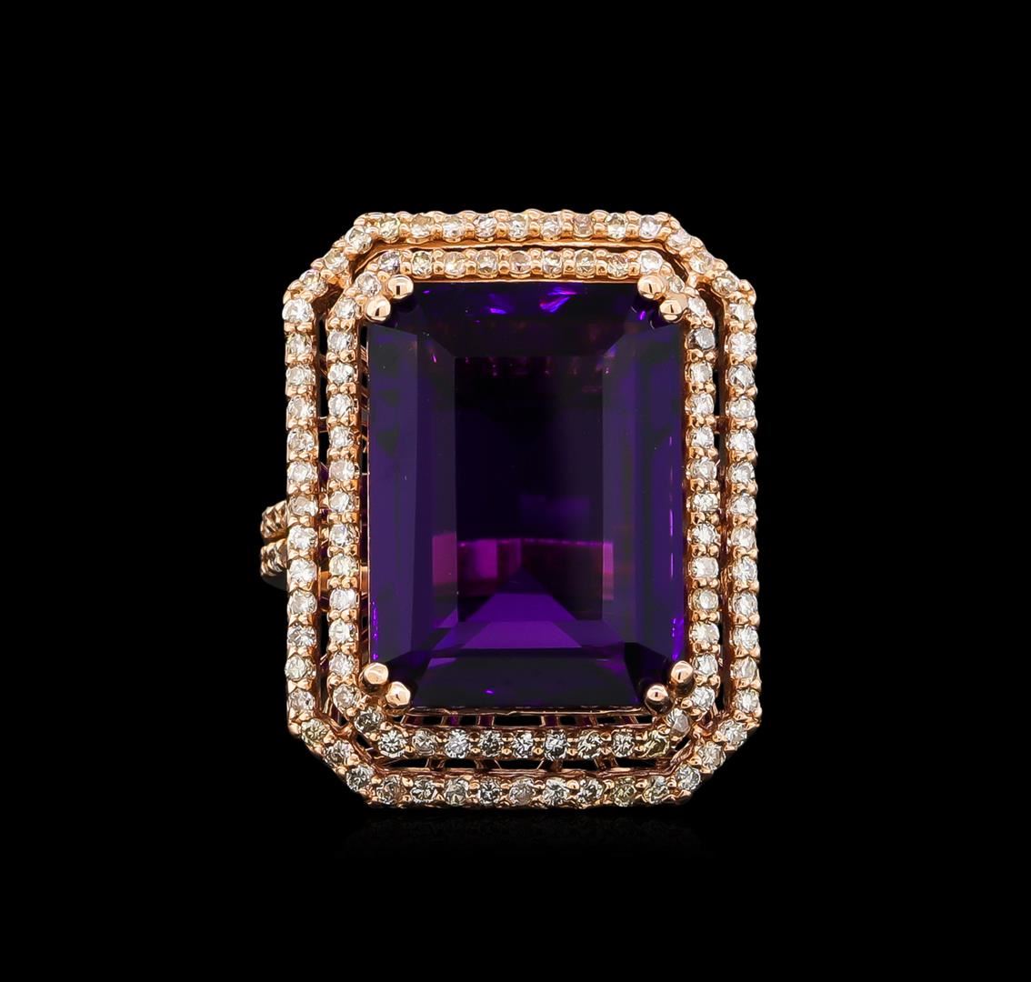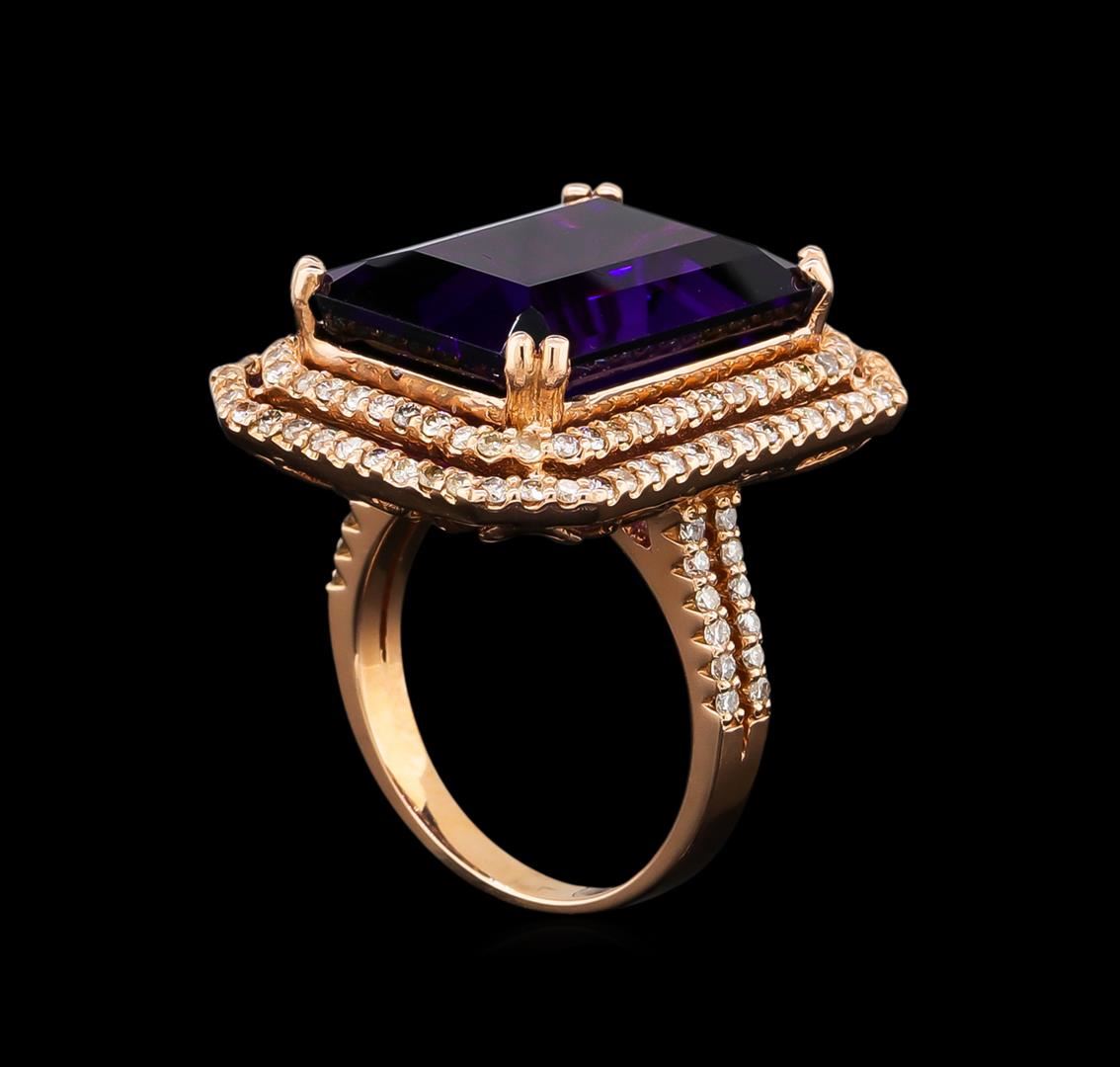 One electronically tested 14KT rose gold Ladies combination cast & assembled ring with a bright polish finish. Condition is new. Identified with markings of "K14". Containing: One prong set emerald standard step cut natural amethyst, measuring 17.96 x 13.10 x 8.50mm, approximate weight of 14.36ct., clarity is eye clean, type II, medium dark, moderately strong, purple color, (GIA P 6/4), cut is very good. Colored gemstones are presumed to have been subjected to commonly used color/clarity enhancement processes. One Hundred Sixteen prong set round brilliant cut diamonds, measuring 1.30 - 1.30 x 0.78mm (depth est.) approximate. Total Weight of 116 Stones = 1.01ct. Clarity: I-1 to I-2. Color: K - L, Cut is Good. Total Weight of Colored Stones 14.36ct. Total Weight of Diamonds 1.01ct. Total Weight of Ring 11.90 grams. GGL Appraised at $7,230.00.