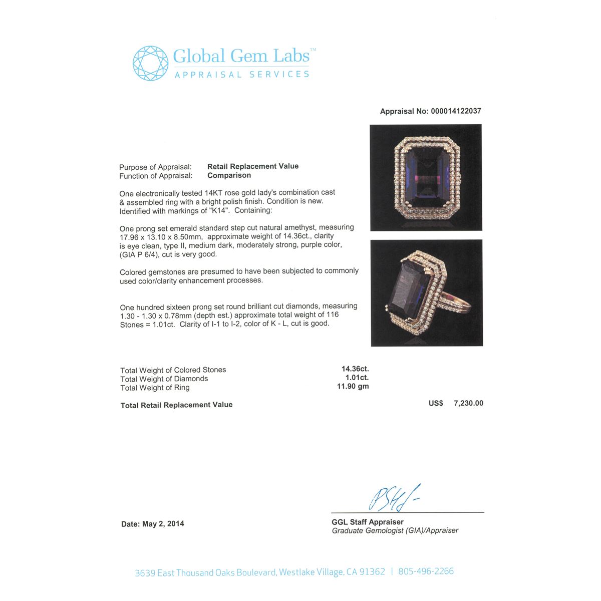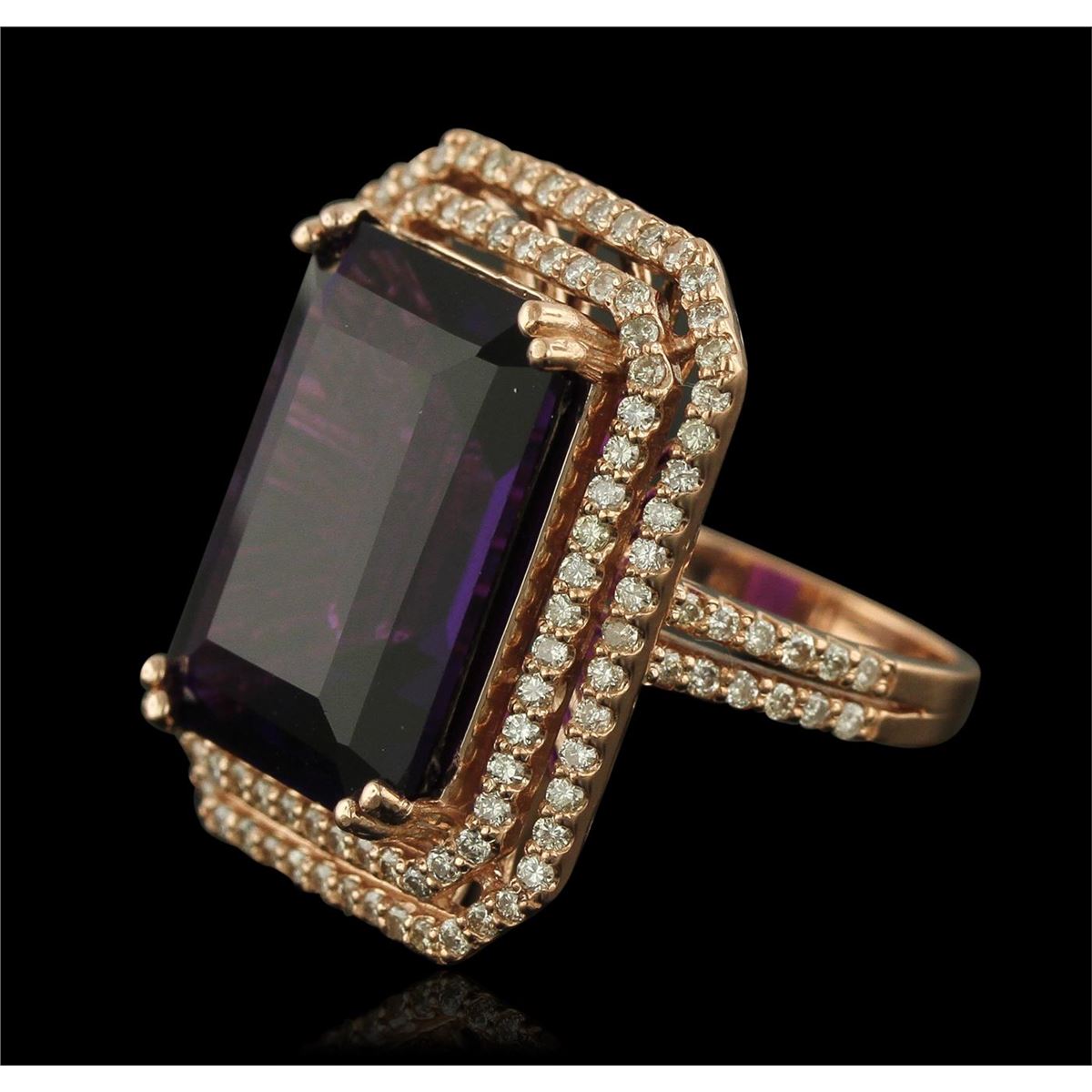 One electronically tested 14KT rose gold Ladies combination cast & assembled ring with a bright polish finish. Condition is new. Identified with markings of "K14". Containing: One prong set emerald standard step cut natural amethyst, measuring 17.96 x 13.10 x 8.50mm, approximate weight of 14.36ct., clarity is eye clean, type II, medium dark, moderately strong, purple color, (GIA P 6/4), cut is very good. Colored gemstones are presumed to have been subjected to commonly used color/clarity enhancement processes. One Hundred Sixteen prong set round brilliant cut diamonds, measuring 1.30 - 1.30 x 0.78mm (depth est.) approximate. Total Weight of 116 Stones = 1.01ct. Clarity: I-1 to I-2. Color: K - L, Cut is Good. Total Weight of Colored Stones 14.36ct. Total Weight of Diamonds 1.01ct. Total Weight of Ring 11.90 grams. GGL Appraised at $7,230.00.
