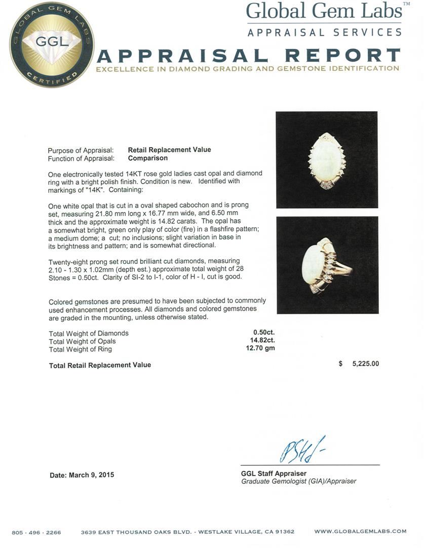 One electronically tested 14KT rose gold ladies cast opal and diamond ring with a bright polish finish. Identified with markings of "14K". Condition is new. Containing: One white opal that is cut in a oval shaped cabochon and is prong set, measuring 21.80 mm long x 16.77 mm wide, and 6.50 mm thick and the approximate weight is 14.82 carats. The opal has a somewhat bright, green only play of color (fire) in a flashfire pattern; a dome; a good cut; no inclusions; consistent in its brightness and pattern; and is somewhat directional. Twenty-Eight prong set round brilliant cut diamonds, measuring 2.10 - 1.30 x 1.02mm (depth est.) approximate total weight of 28 Stones = 0.50ct.. Clarity: SI-2 to I-1. Color: H - I, Cut is Good. Colored gemstones are presumed to have been subjected to commonly used enhancement processes. All diamonds and colored gemstones are graded in the mounting, unless otherwise stated.. Total Weight of Diamonds 0.50ct.. Total Weight of Opals 14.82ct.. Total Weight of Ring 12.70 grams. GGL Appraised at $5,225.00.
