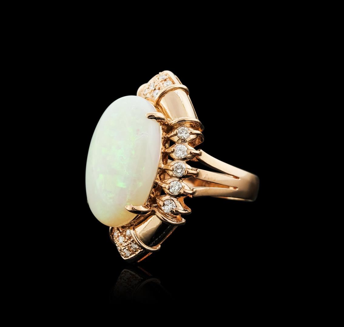 One electronically tested 14KT rose gold ladies cast opal and diamond ring with a bright polish finish. Identified with markings of "14K". Condition is new. Containing: One white opal that is cut in a oval shaped cabochon and is prong set, measuring 21.80 mm long x 16.77 mm wide, and 6.50 mm thick and the approximate weight is 14.82 carats. The opal has a somewhat bright, green only play of color (fire) in a flashfire pattern; a dome; a good cut; no inclusions; consistent in its brightness and pattern; and is somewhat directional. Twenty-Eight prong set round brilliant cut diamonds, measuring 2.10 - 1.30 x 1.02mm (depth est.) approximate total weight of 28 Stones = 0.50ct.. Clarity: SI-2 to I-1. Color: H - I, Cut is Good. Colored gemstones are presumed to have been subjected to commonly used enhancement processes. All diamonds and colored gemstones are graded in the mounting, unless otherwise stated.. Total Weight of Diamonds 0.50ct.. Total Weight of Opals 14.82ct.. Total Weight of Ring 12.70 grams. GGL Appraised at $5,225.00.