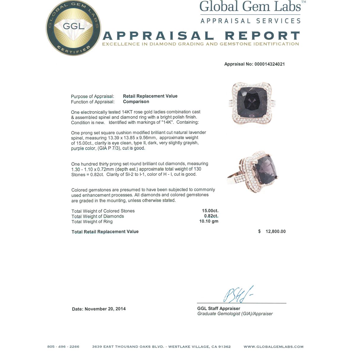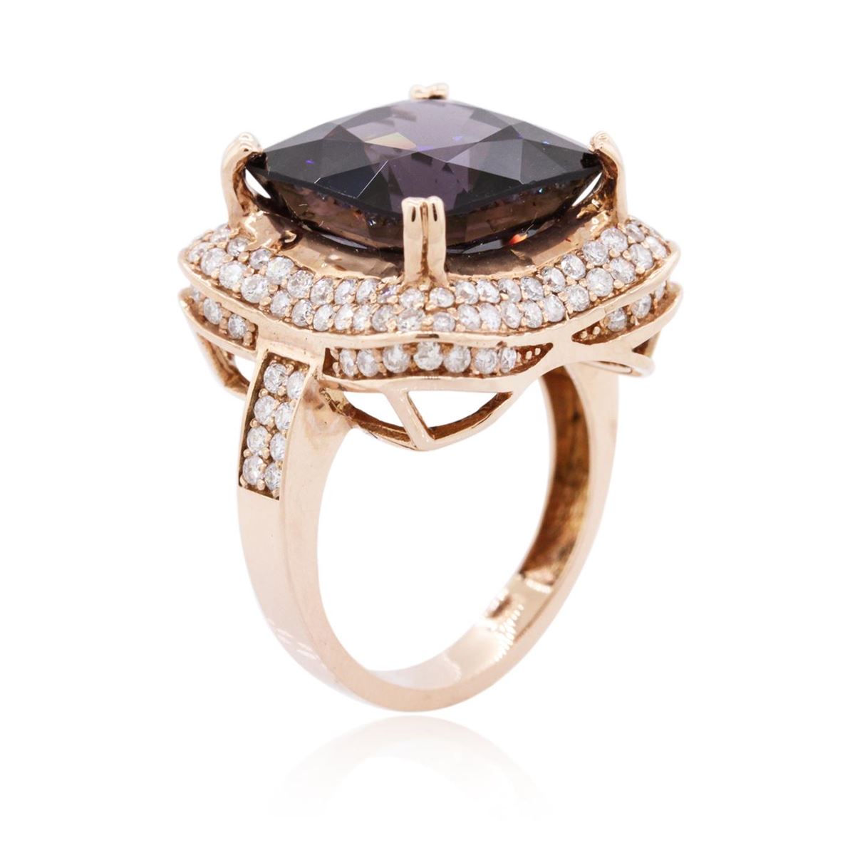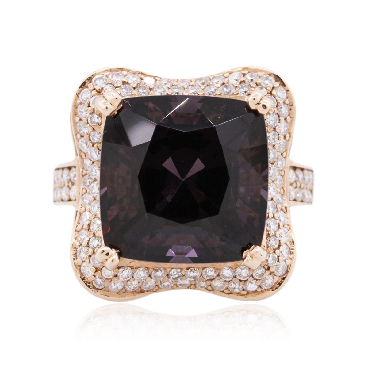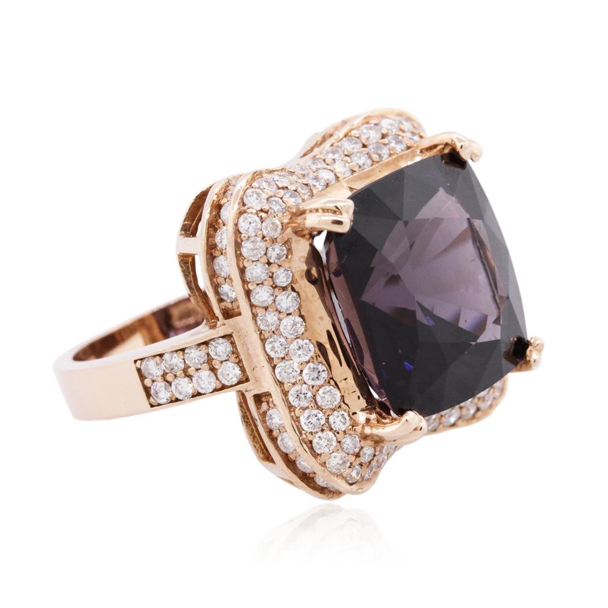 One electronically tested 14KT rose gold ladies combination cast & assembled spinel and diamond ring with a bright polish finish. Identified with markings of "14K". Condition is new. Containing: One prong set square cushion modified brilliant cut natural lavender spinel, measuring 13.39 x 13.85 x 9.56mm, approximate weight of 15.00ct., clarity is eye clean, type II, dark, very slightly grayish, purple color, (GIA P 7/3), cut is good. One Hundred Thirty prong set round brilliant cut diamonds, measuring 1.30 - 1.10 x 0.72mm (depth est.) approximate total weight of 130 Stones = 0.82ct. Clarity: SI-2 to I-1. Color: H - I, Cut is Good. Colored gemstones are presumed to have been subjected to commonly used enhancement processes. All diamonds and colored gemstones are graded in the mounting, unless otherwise stated. Total Weight of Colored Stones 15.00ct. Total Weight of Diamonds 0.82ct. Total Weight of Ring 10.10 grams. GGL Appraised at $12,800.00.