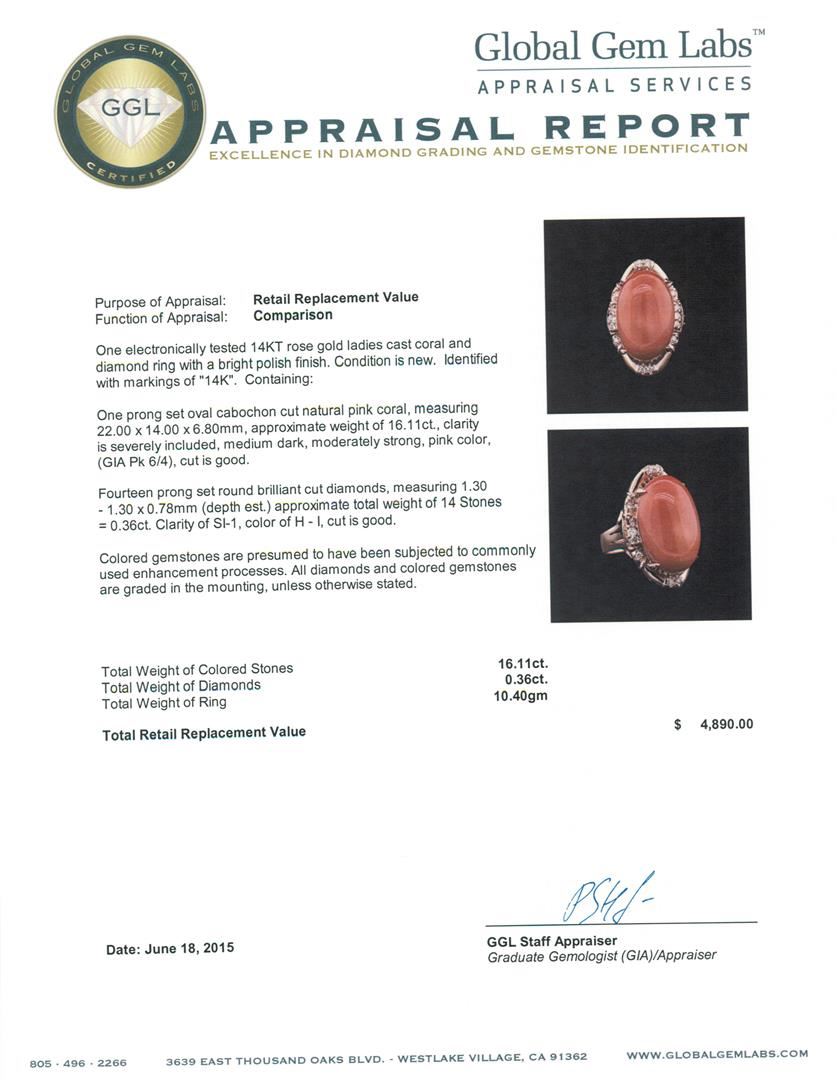 One electronically tested 14KT rose gold ladies cast coral and diamond ring with a bright polish finish. Identified with markings of "14K". Condition is new. Containing: One prong set oval cabochon cut natural pink coral, measuring 22.00 x 14.00 x 6.80mm, approximate weight of 16.11ct., clarity is severely included, medium dark, moderately strong, pink color, (GIA Pk 6/4), cut is good. Fourteen prong set round brilliant cut diamonds, measuring 1.30 - 1.30 x 0.78mm (depth est.) approximate total weight of 14 Stones = 0.36ct. Clarity: SI-1. Color: H - I, Cut is Good. Colored gemstones are presumed to have been subjected to commonly used enhancement processes. All diamonds and colored gemstones are graded in the mounting, unless otherwise stated. Total Weight of Colored Stones 16.11ct. Total Weight of Diamonds 0.36ct. Total Weight of Ring 10.40 grams. GGL Appraised at $4,890.00.