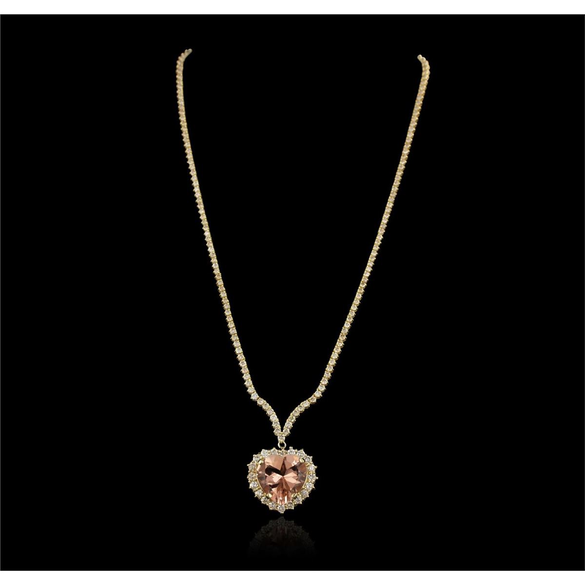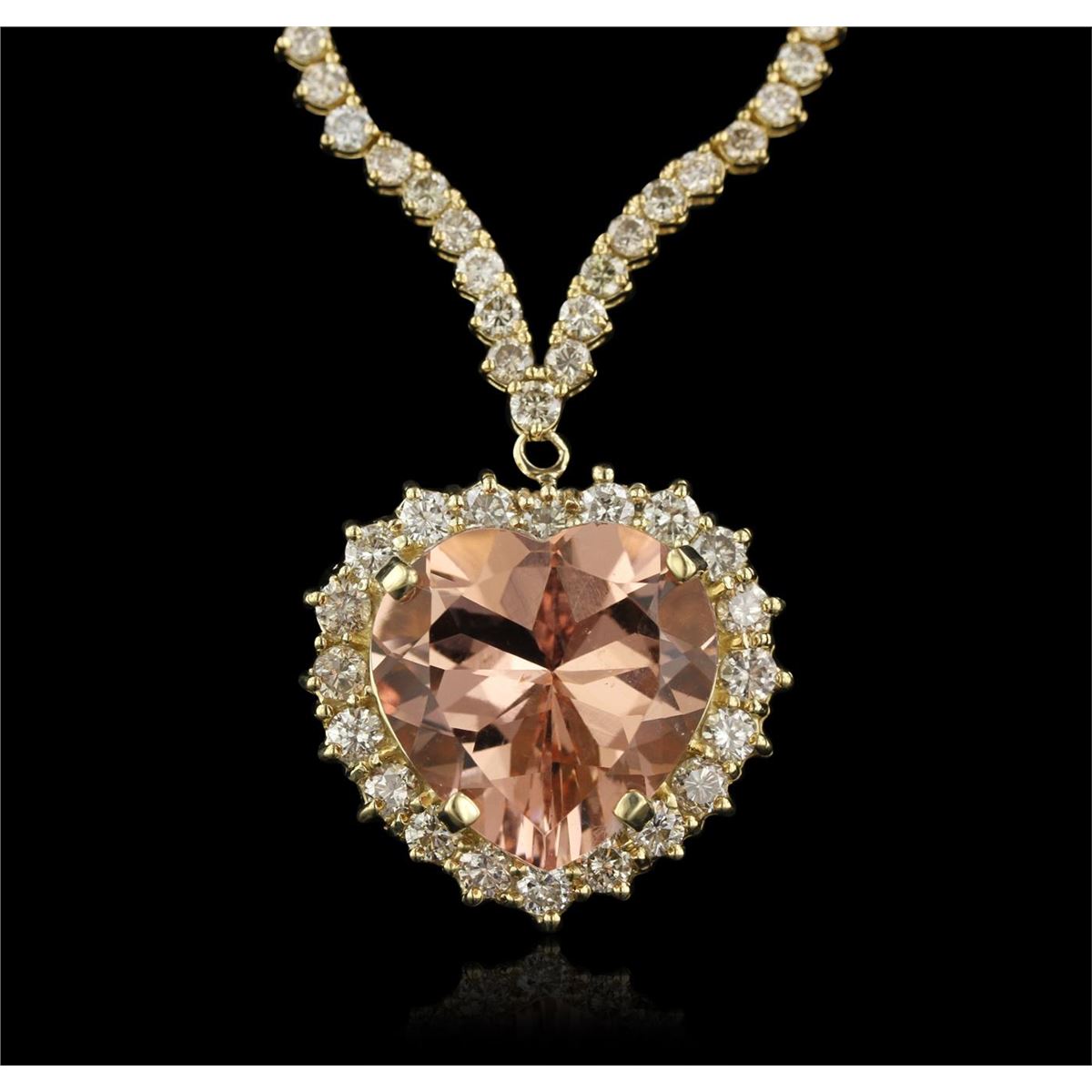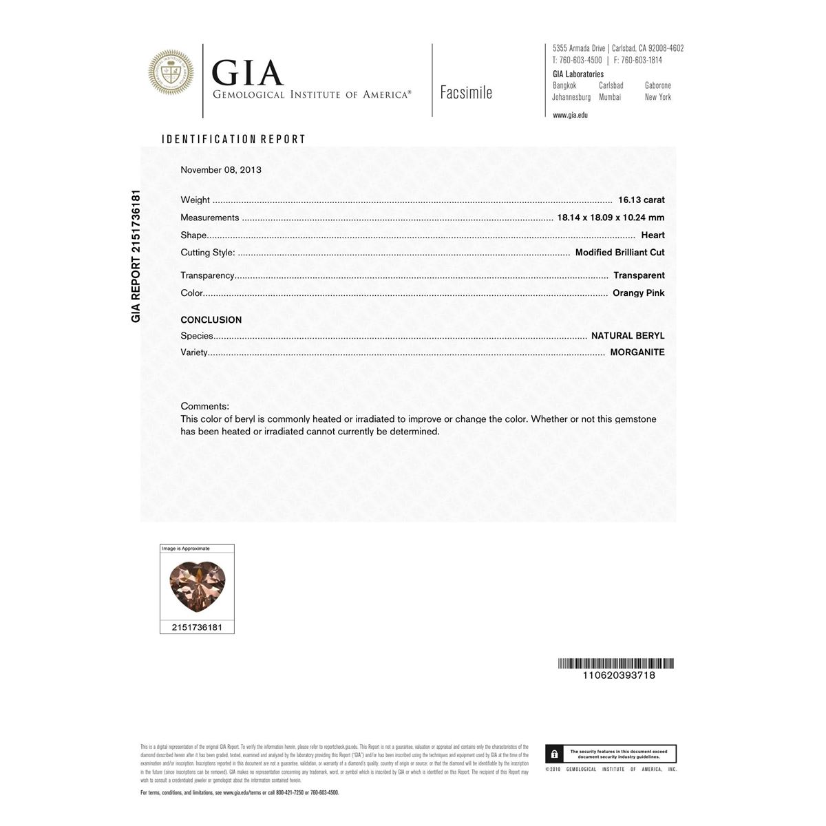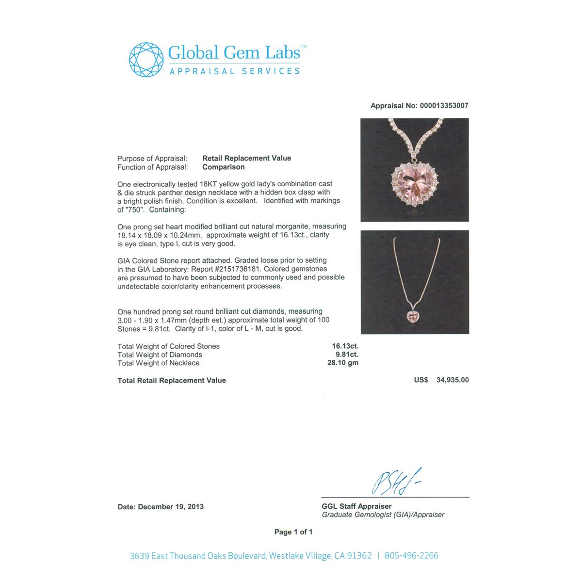 One electronically tested 18KT yellow gold Ladies combination cast & die struck panther design necklace with a hidden box clasp with a bright polish finish. Identified with markings of "750". Condition is excellent. Containing: One prong set heart modified brilliant cut natural morganite, measuring 18.14 x 18.09 x 10.24mm, approximate weight of 16.13ct., clarity is eye clean, type I, cut is very good. GIA Colored Stone report attached. Graded loose prior to setting in the GIA Laboratory: Report #2151736181. Colored gemstones are presumed to have been subjected to commonly used and possible undetectable color/clarity enhancement processes. One Hundred prong set round brilliant cut diamonds, measuring 3.00 - 1.90 x 1.47mm (depth est.) approximate total weight of 100 Stones = 9.81ct. Clarity of I-1, Color of L - M, Cut is Good. Total Weight of Colored Stones 16.13ct. Total Weight of Diamonds 9.81ct. Total Weight of Necklace 28.10gm. GGL Appraised at $34,935.00.