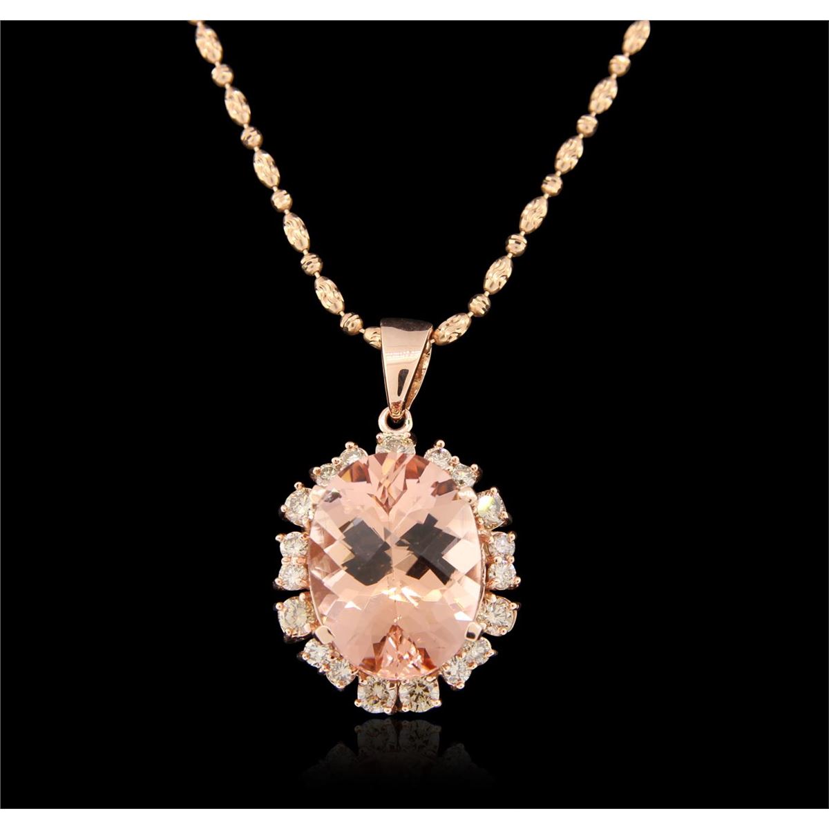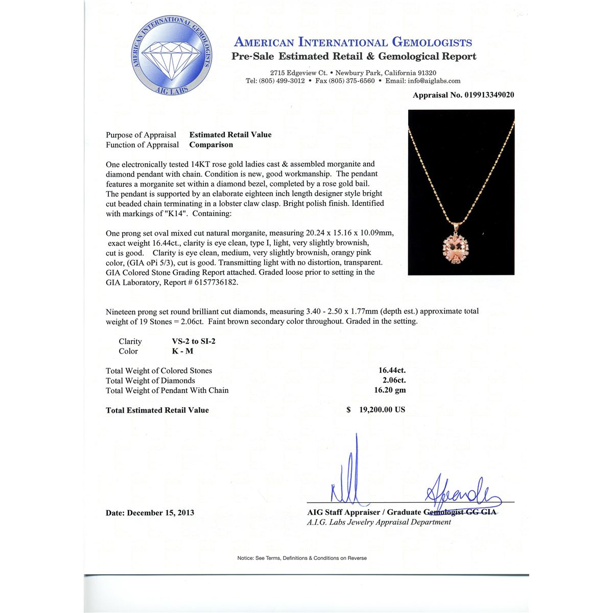 One electronically tested 14KT rose gold ladies cast & assembled morganite and diamond pendant with chain. The pendant features a morganite set within a diamond bezel, completed by a rose gold bail. The pendant is supported by an elaborate eighteen inch length designer style bright cut beaded chain terminating in a lobster claw clasp. Bright polish finish. Identified with markings of "K14". Condition is new, good workmanship. Containing: One prong set oval mixed cut natural morganite, measuring 20.24 x 15.16 x 10.09mm, exact weight 16.44ct., clarity is eye clean, type I, light, very slightly brownish, cut is good. Clarity is eye clean, medium, very slightly brownish, orangy pink color, (GIA oPi 5/3), cut is good. Transmitting light with no distortion, transparent. GIA Colored Stone Grading Report attached. Graded loose prior to setting in the GIA Laboratory, Report # 6157736182.Nineteen prong set round brilliant cut diamonds, measuring 3.40 - 2.50 x 1.77mm (depth est.) approximate. Total Weight of 19 Stones = 2.06ct. Faint brown secondary color throughout. Graded in the setting. Clarity: VS-2 to SI-2. Color: K - M. Total Weight of Colored Stones 16.44ct.. Total Weight of Diamonds 2.06ct. AIG Appraised at $19,200.00.