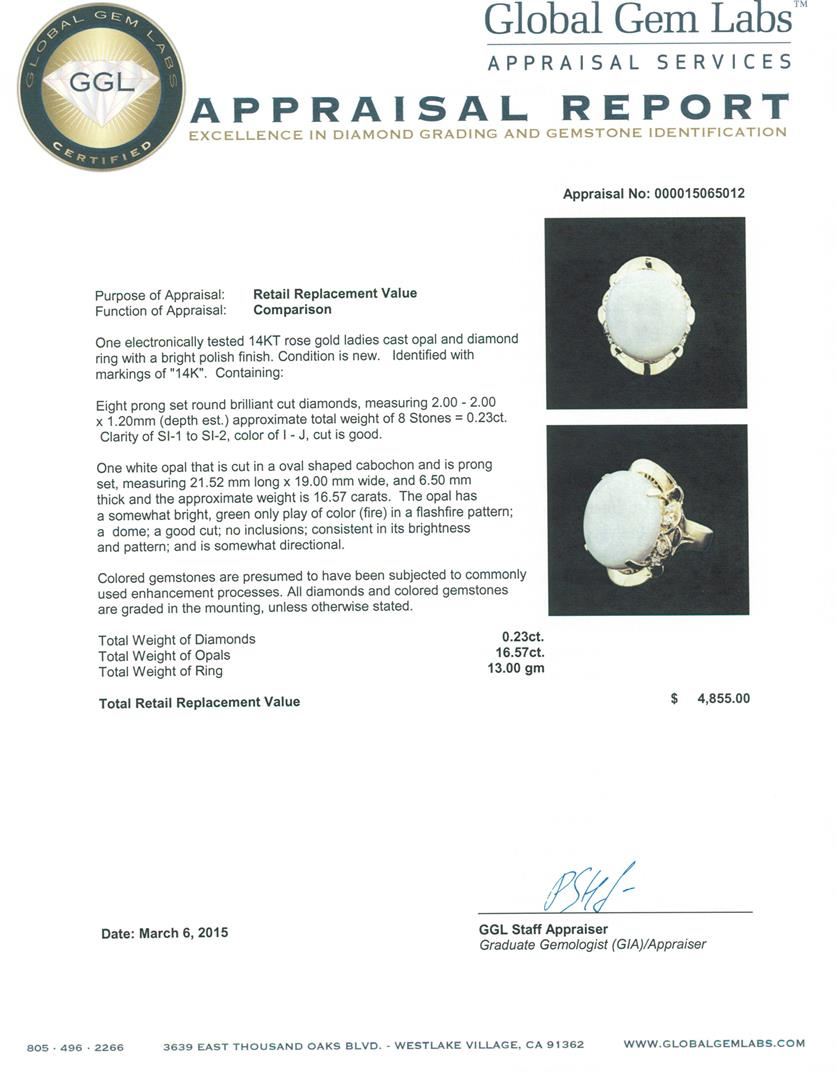 One electronically tested 14KT rose gold ladies cast opal and diamond ring with a bright polish finish. Identified with markings of "14K". Condition is new. Containing: Eight prong set round brilliant cut diamonds, measuring 2.00 - 2.00 x 1.20mm (depth est.) approximate total weight of 8 Stones = 0.23ct.. Clarity: SI-1 to SI-2. Color: I - J, Cut is Good. One white opal that is cut in a oval shaped cabochon and is prong set, measuring 21.52 mm long x 19.00 mm wide, and 6.50 mm thick and the approximate weight is 16.57 carats. The opal has a somewhat bright, green only play of color (fire) in a flashfire pattern; a dome; a good cut; no inclusions; consistent in its brightness and pattern; and is somewhat directional. Colored gemstones are presumed to have been subjected to commonly used enhancement processes. All diamonds and colored gemstones are graded in the mounting, unless otherwise stated.. Total Weight of Diamonds 0.23ct.. Total Weight of Opals 16.57ct.. Total Weight of Ring 13.00 grams. GGL Appraised at $4,855.00.