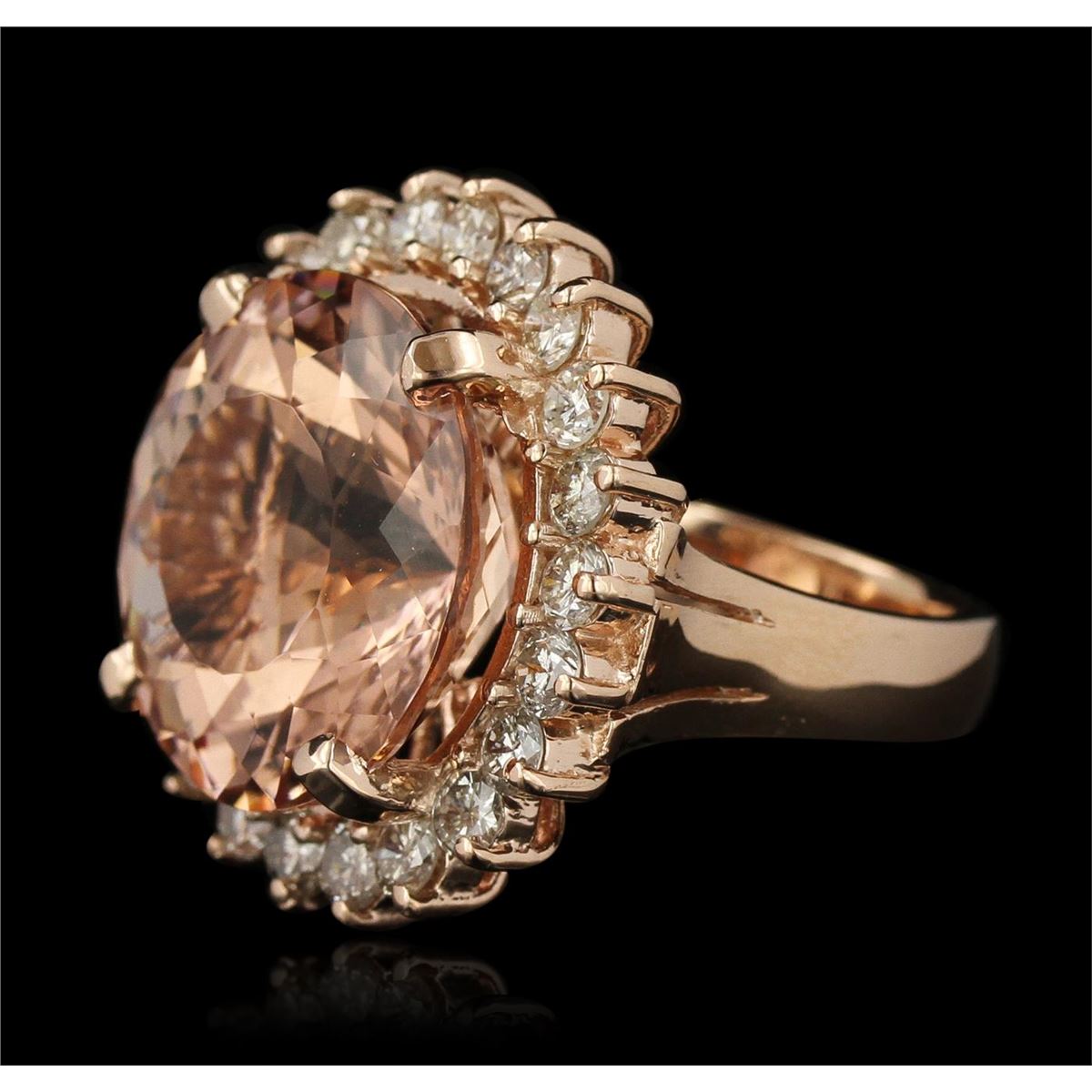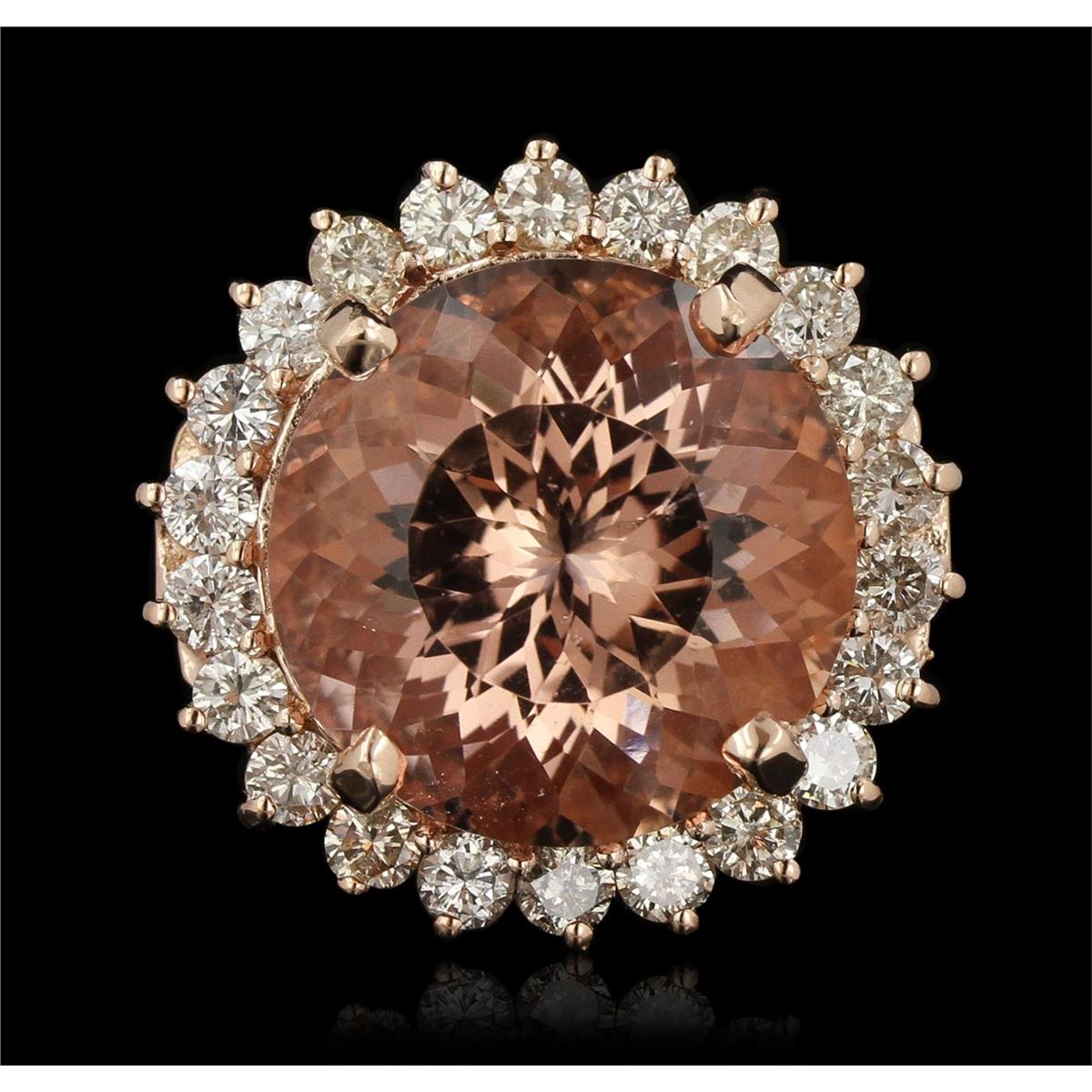 One electronically tested 14KT rose gold ladies cast morganite and diamond ring with a bright polish finish. The featured morganite is set within a diamond bezel supported by split shoulders and completed by a four and one half millimeter wide band. Identified with markings of "K14". Condition is new, good workmanship. Containing: One prong set round modified brilliant cut natural morganite, measuring 17.94 - 17.74 x 11.35 mm, exact total weight 18.02ct., type I Clarity is eye clean, medium, very slightly brownish, orangy pink color, (GIA oPi 5/3), cut is good. Transmitting light with no distortion, transparent. GIA Colored Stone Grading Report attached. Graded loose prior to setting in the GIA Laboratory, Report # 1156736314.Twenty-Two prong set round brilliant cut diamonds, measuring 3.00 - 3.00 x 1.80mm (depth est.) approximate. Total Weight of 22 Stones = 2.27ct. Graded in the setting. Clarity: SI-2 to I-1 . Color: H - J. Total Weight of Colored Stones 18.02ct. Total Weight of Diamonds 2.27ct. AIG Appraised at $21,440.00.