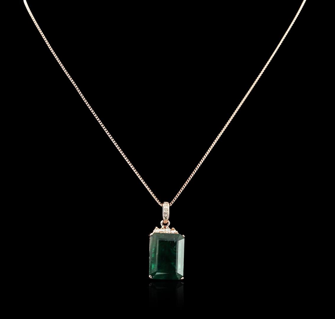 One electronically tested 14KT rose gold ladies combination cast & assembled emerald and diamond pendant & chain 18.0" long, thin wheat link with a lobster claw clasp with a bright polish finish. Identified with markings of "14K". Condition is new. Containing: One prong set emerald modified step cut natural emerald, measuring 20.17 x 15.04 x 8.43mm, approximate weight of 18.78ct., clarity is heavily included, type III, medium dark, slightly grayish, green color, (GIA G 6/2), cut is good. Fourteen prong set round brilliant cut diamonds, measuring 2.00 - 1.50 x 1.05mm (depth est.) approximate total weight of 14 Stones = 0.27ct. Clarity: SI-1 to I-1. Color: J - K, Cut is Good. Diamonds and colored gemstones are graded in the mounting, unless otherwise stated. Colored gemstones are presumed to have been subjected to commonly used enhancement processes. Total Weight of Colored Stones 18.78ct. Total Weight of Diamonds 0.27ct. Total Weight of Pendant & Chain 12.10 grams. GGL Appraised at $4,685.00.
