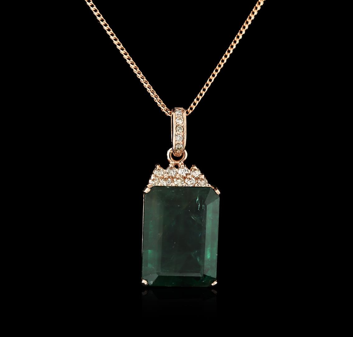 One electronically tested 14KT rose gold ladies combination cast & assembled emerald and diamond pendant & chain 18.0" long, thin wheat link with a lobster claw clasp with a bright polish finish. Identified with markings of "14K". Condition is new. Containing: One prong set emerald modified step cut natural emerald, measuring 20.17 x 15.04 x 8.43mm, approximate weight of 18.78ct., clarity is heavily included, type III, medium dark, slightly grayish, green color, (GIA G 6/2), cut is good. Fourteen prong set round brilliant cut diamonds, measuring 2.00 - 1.50 x 1.05mm (depth est.) approximate total weight of 14 Stones = 0.27ct. Clarity: SI-1 to I-1. Color: J - K, Cut is Good. Diamonds and colored gemstones are graded in the mounting, unless otherwise stated. Colored gemstones are presumed to have been subjected to commonly used enhancement processes. Total Weight of Colored Stones 18.78ct. Total Weight of Diamonds 0.27ct. Total Weight of Pendant & Chain 12.10 grams. GGL Appraised at $4,685.00.