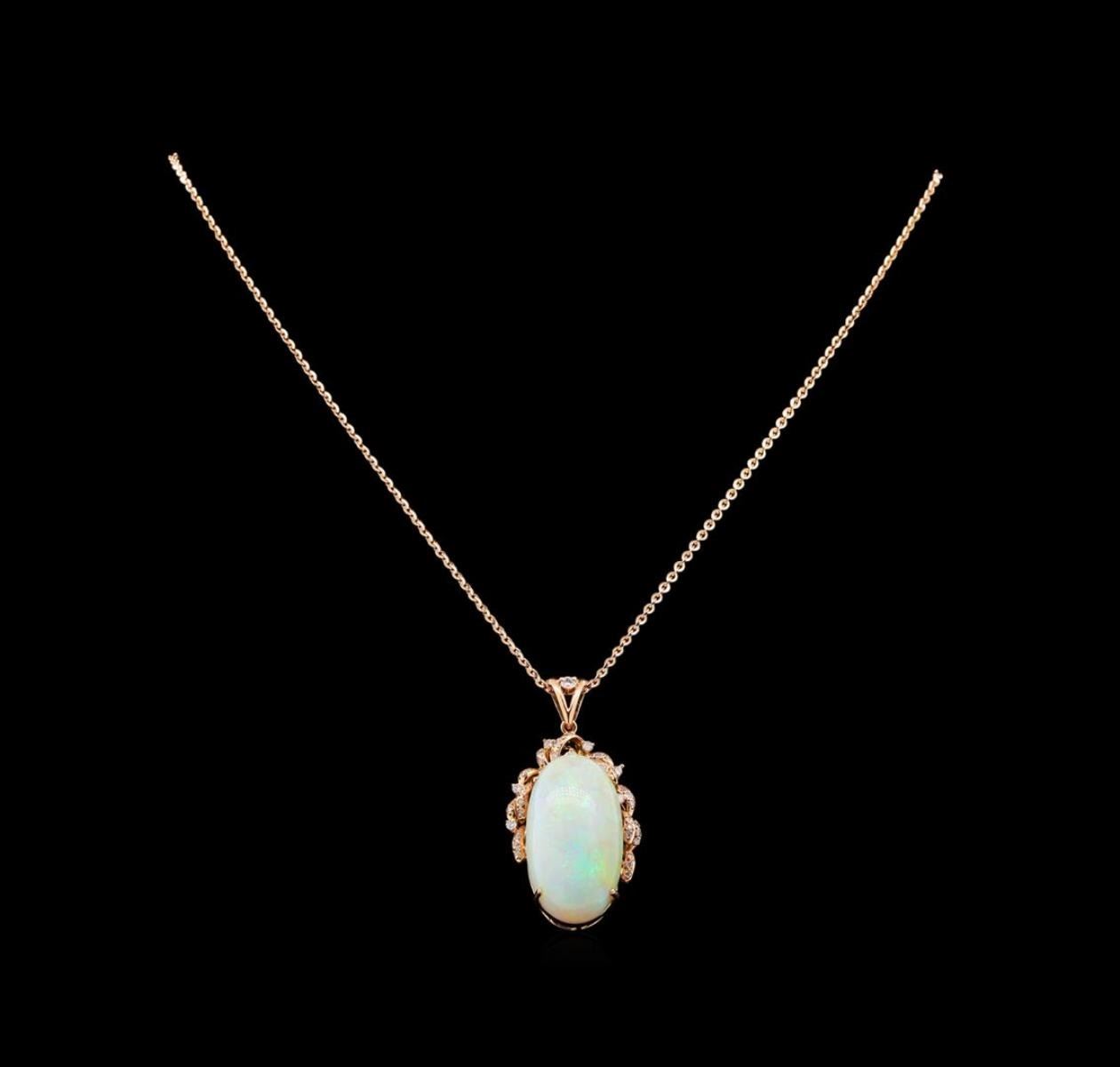 One electronically tested 14KT rose gold ladies cast opal and diamond pendant & chain 18.0" long, with a lobster claw clasp with a bright polish finish. Identified with markings of "14K". Condition is new. Containing: One white opal that is cut in a oval shaped cabochon and is prong set, measuring 29.00 mm long x 15.00 mm wide, and 7.20 mm thick and the approximate weight is 19.53 carats. The opal has a somewhat bright, green only play of color (fire) in a flashfire pattern; a medium dome; a good cut; no inclusions; slight variation in base in its brightness and pattern; and is somewhat directional. Thirty-Seven prong set round brilliant cut diamonds, measuring 2.50 - 1.30 x 1.14mm (depth est.) approximate total weight of 37 Stones = 0.30 ct. Clarity: SI-1 to I-1. Color: I - J, Cut is Good. Colored gemstones are presumed to have been subjected to commonly used enhancement processes. All colored gemstones are graded in the mounting, unless otherwise stated. Total Weight of Diamonds 0.30 ct. Total Weight of Opals 19.53ct. Total Weight of Pendant & Chain 14.70 grams. GGL Appraised.